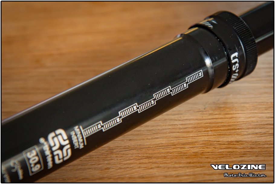 Eénmaal gemonteerd en op pad veert de TRS+ soepel in en uit. De werking van de hendel is probleemloos en het stukje grip-tape zorgt – niet geheel verrassend – voor veel grip. De stalen veer van de pen is aan de lichte kant. Ik ben zelf een pen met een hele sterke retour gewend – een Specialized Command Post IR – en rem zodoende de slag af met m’n achterwerk. Doe je dat bij de TRS+ dan wil ‘ie niet altijd vol uitveren. Kont van het zadel dus!