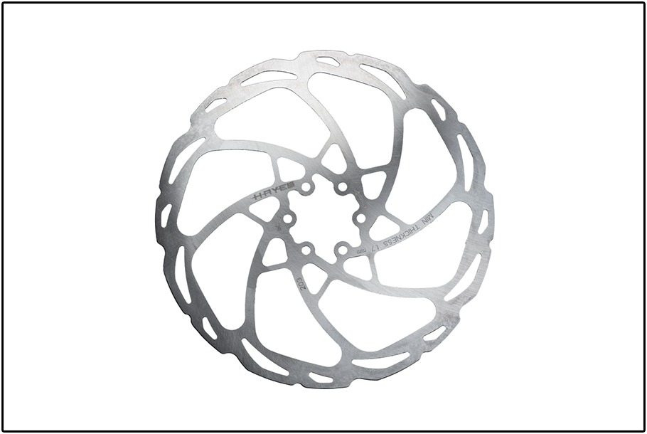 Bij presentaties van nieuwigheden is het goed om de bullshit-radar scherp te hebben staan. Bij ons ging ‘ie lichtjes af toen men begon over het ‘Modal Resonance Cancelation’ (MRC) concept waarmee de remschijven zijn voorzien. Hayes zegt de remschijven te hebben geoptimaliseerd in samenspraak met de remblokken op basis van hun eigenfrequentie. De gedachte hierbij is dat de trillingen die ontstaan bij het remmen, dermate op elkaar zijn afgestemd, dat ze zeer miniem zijn. Trillingen betekenen geluid, dus minder trillingen betekent minder geluid. Hoewel dit theoretisch een goed verhaal is, ontstaat (piepend of krijsend) geluid bij het remmen niet alleen door de paring van remblokken en remschijf. De eigenfrequentie van de gehele constructie speelt hierin mee, dus ook de remklauw, de bevestigingsmiddelen, de vork… alles. Goed; als de trillingen bij de bron al verlaagd zijn, ben je al een heel eind om tot zo stil mogelijke remmen te komen.
