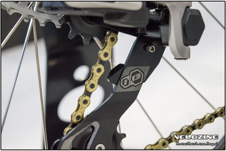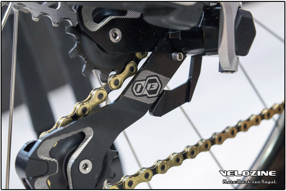 Met 12 speed inmiddels gemeengoed, zien zij de stap naar 13 kransen dan nog werkbaar. Daarbij gaan ze overigens uit van een 12 speed spatiëring en is de set dus uitgevoerd met een 12 speed ketting (van KMC, momenteel). Overigens is de derailleur voorzien van een knopje waarmee je hem als 12 speed derailleur kunt gebruiken.
