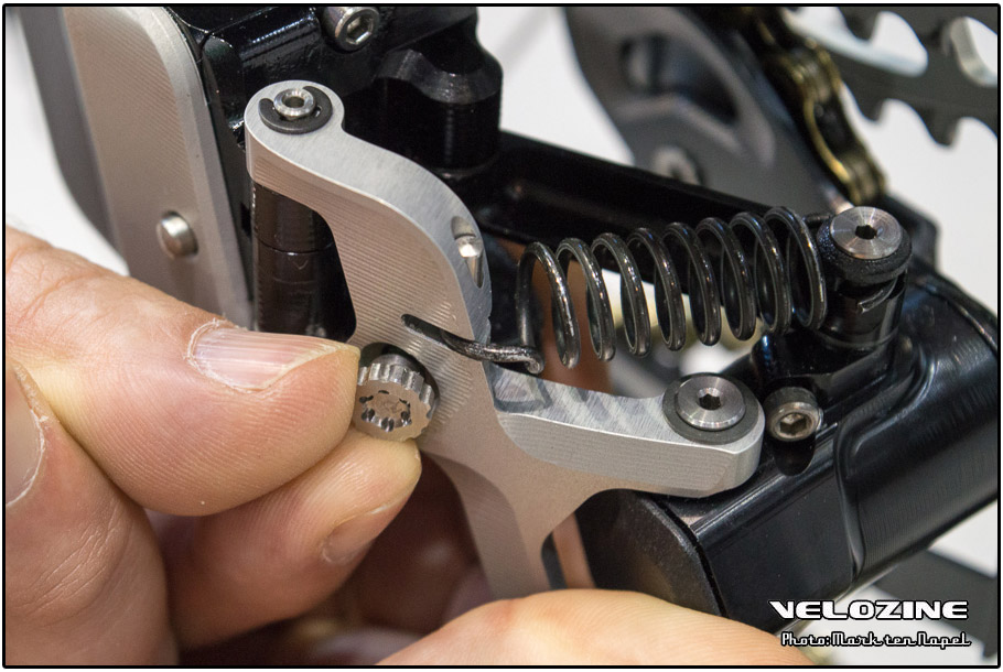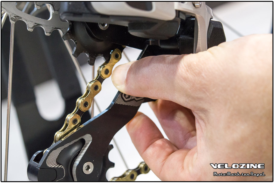 Zo loopt de kettingkooi aan de achterzijde niet door over de gehele lengte. Beide derailleurwieltjes hebben individuele ‘kooitjes’. Halfweg, tussen de derailleurwieltjes in, zit een ‘tab’ die de kooi feitelijk verbindt met de veer en clutch in het b-scharnier. Druk deze tab naar het wiel toe en je ontgrendelt de kooi ten opzichte van de veer, om een wielwissel te vergemakkelijken. De clutch zelf hebben we in detail nog niet kunnen bekijken. De werking zou zich baseren op een torsieveer die dusdanig is uitgelegd dat ie bij het opspannen kleiner van diameter wordt (zoals eigenlijk elke torsieveer) en dan juist meer wrijving genereert op zichzelf en ten opzichte van de as waar hij rond zit. De demping was duidelijk merkbaar en voelde zo op het eerste gevoel bij de derailleur op de display zeer solide.