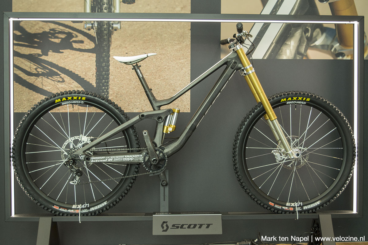Naast ‘de lichtste Scott Gambler downhillbike ter wereld’ (13,42 kg) stond ook zijn nieuwste creatie op de stand van Scott; een flink geprepareerde Spark RC die hij de ‘Hyperspark’ noemt. Vooraan de nieuwe Intend Samurai CC voorvork. Volgens de ontwerper/maker Cornelius Kapfinger is het met 1.385 gram de lichtste voorvork op de markt met 120 mm veerweg. De Samurai is een doorontwikkeling van de Hero RD upside-down-voorvork die we eerder al eens bekeken. En net als die Hero RD maakt de Samurai CC (en zijn iets zwaardere XC-broer) gebruik van de RockShox Charger Raceday-demper uit de RockShox SID.