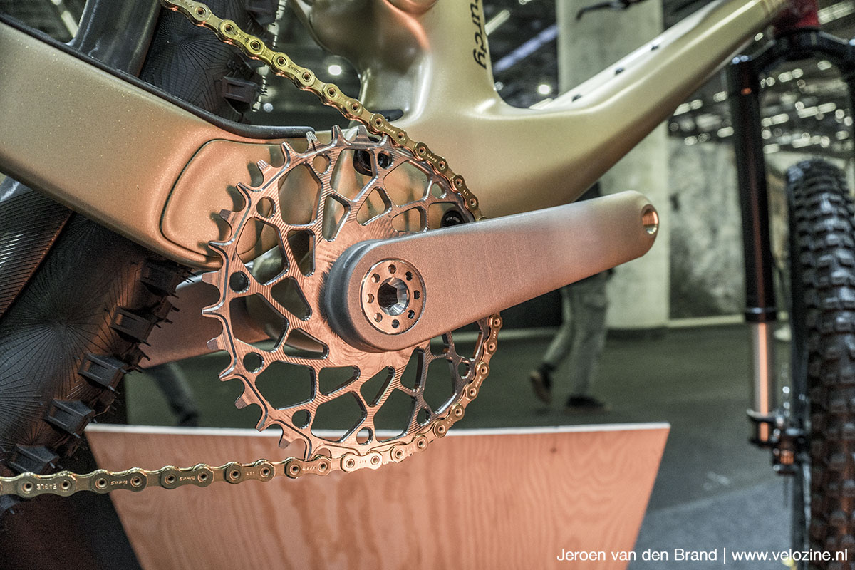 Dankzij steeds beter wordende 3D-printtechnieken zien we steeds meer kleinere spelers op de markt komen. Het doet herinneren aan de jaren ’90 waarin iedereen met een freesmachine of draaibank unieke fietsonderdelen leek te maken. Deze titanium crankset van het Engelse Sturdy Cycles kwamen we tegen op de stand van Trickstuff.