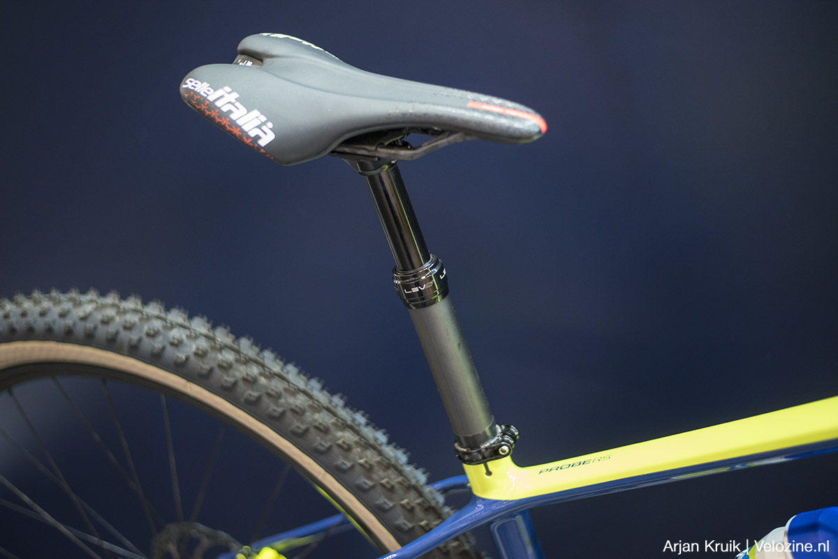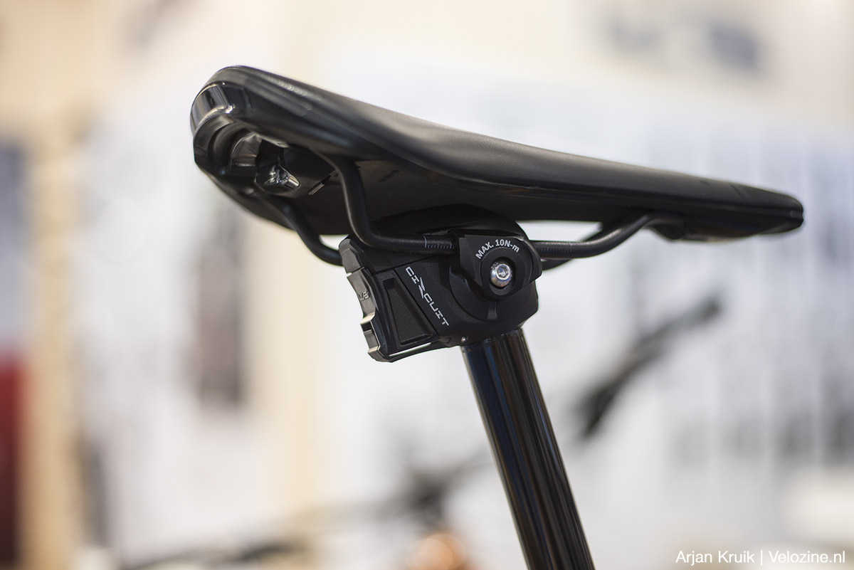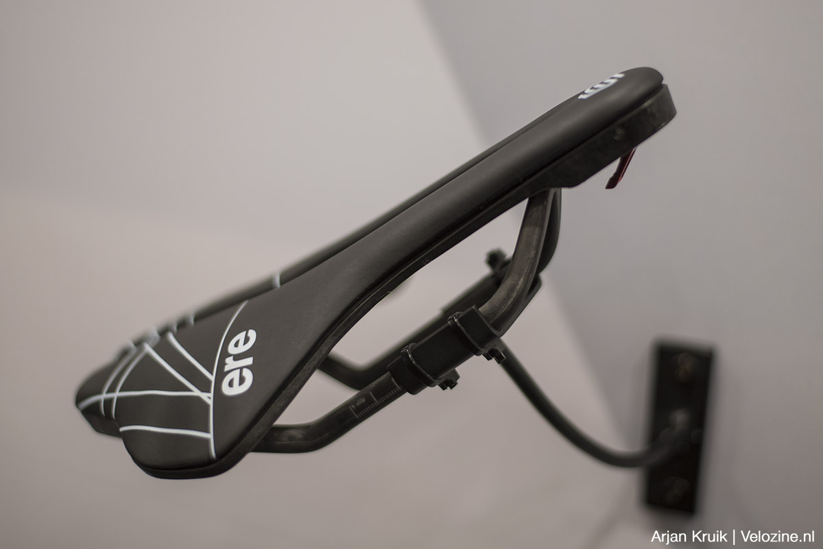 De Ere Genus Pro heeft een carbon onderstel en een ‘comfort trigger‘. Dat is dat rode hendeltje onder de zadelneus.