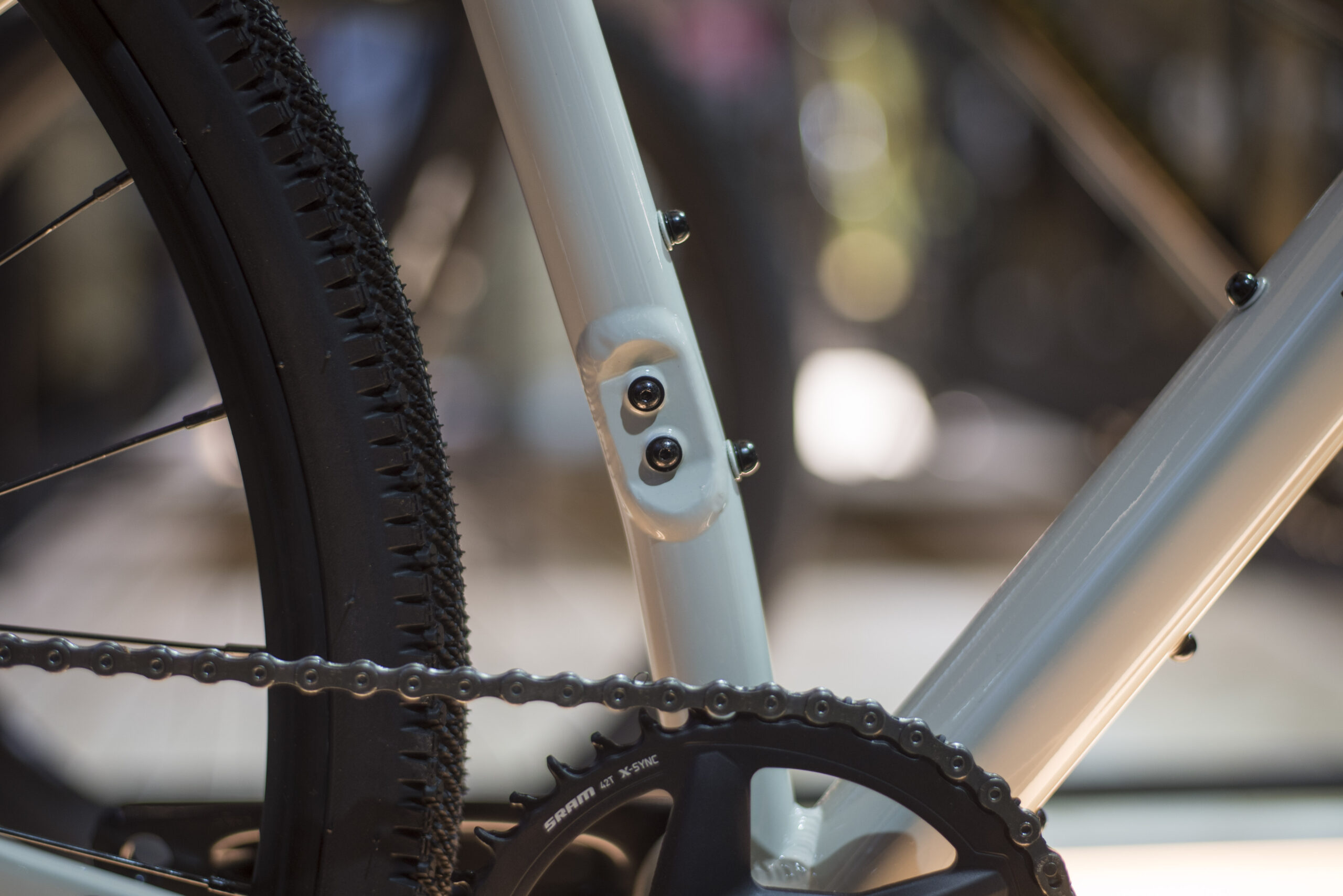 Collega Mark gaat kwijlen als je ‘m een plaatje van deze gravelbike van het Duitse Liteville laat zien: de 4ONE M2. Dit beursexemplaar heeft een vaste zadelpen, maar er past ook een geïntegreerde Eightpins-dropper in.