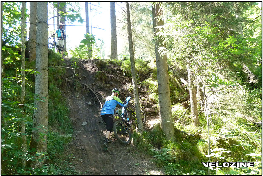Na driekwart van de trail werd er gestopt bij de eerder genoemde drop. Joost zijn eerste reactie: “Oh… dat valt wel mee met die hoogte…” Tja, daar stonden we dan op dezelfde plek waar we daags voordien een dikke tien minuten in het gat stonden te staren (alvorens onze ‘normale’ route te vervolgen). Lars wilde hem rijden en ik hoorde in gedachte de traumahelikopter al aankomen. Joost deed hem een aantal keren voor. Ja, het cliché is waar: dan lijkt het in eens kinderspel. “Hoe langer je wacht, hoe moeilijker het wordt…” – aldus Joost en met die inspirerende woorden stortte Lars zich – achteraf gemakkelijk – naar beneden. Gevolgd door enige euforie. Saillant detail was dat de drop direct ná dit genomen obstakel eigenlijk nog lastiger was.
