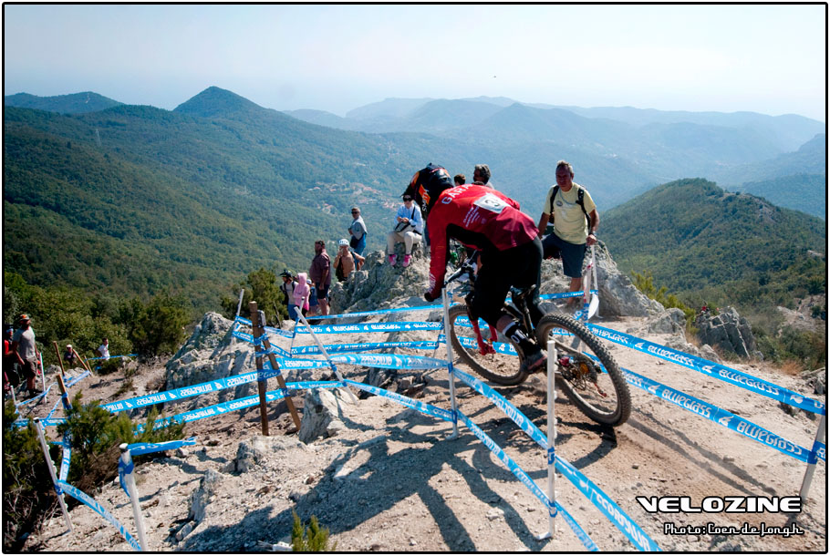 Gap that shit! Iedereen, zonder uitzondering, reed hier op stage Rocche Gianche met de wielen aan de grond de eerste meters, alleen de fransoos Youn Deniaud gapte dit stuk trail.