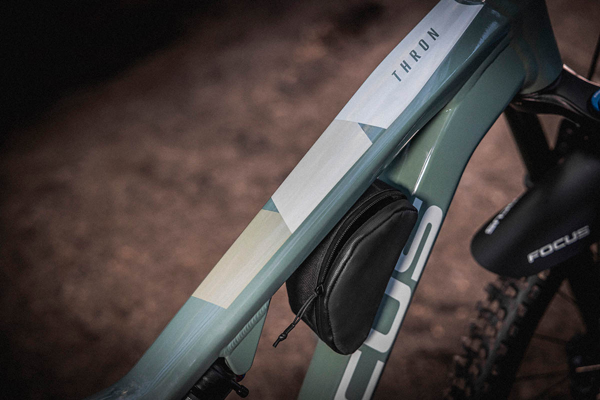 Zowel de Thron als Jam hebben óók montagepunten voor een toolbag. Aan de bovenzijde van de onderbuis kun je een specifiek tasje kwijt. Intern zorgt een klittenband ervoor dat je binnenband, CO2-patroon, tooltje en/of pomp rammelvrij opgeborgen zitten.