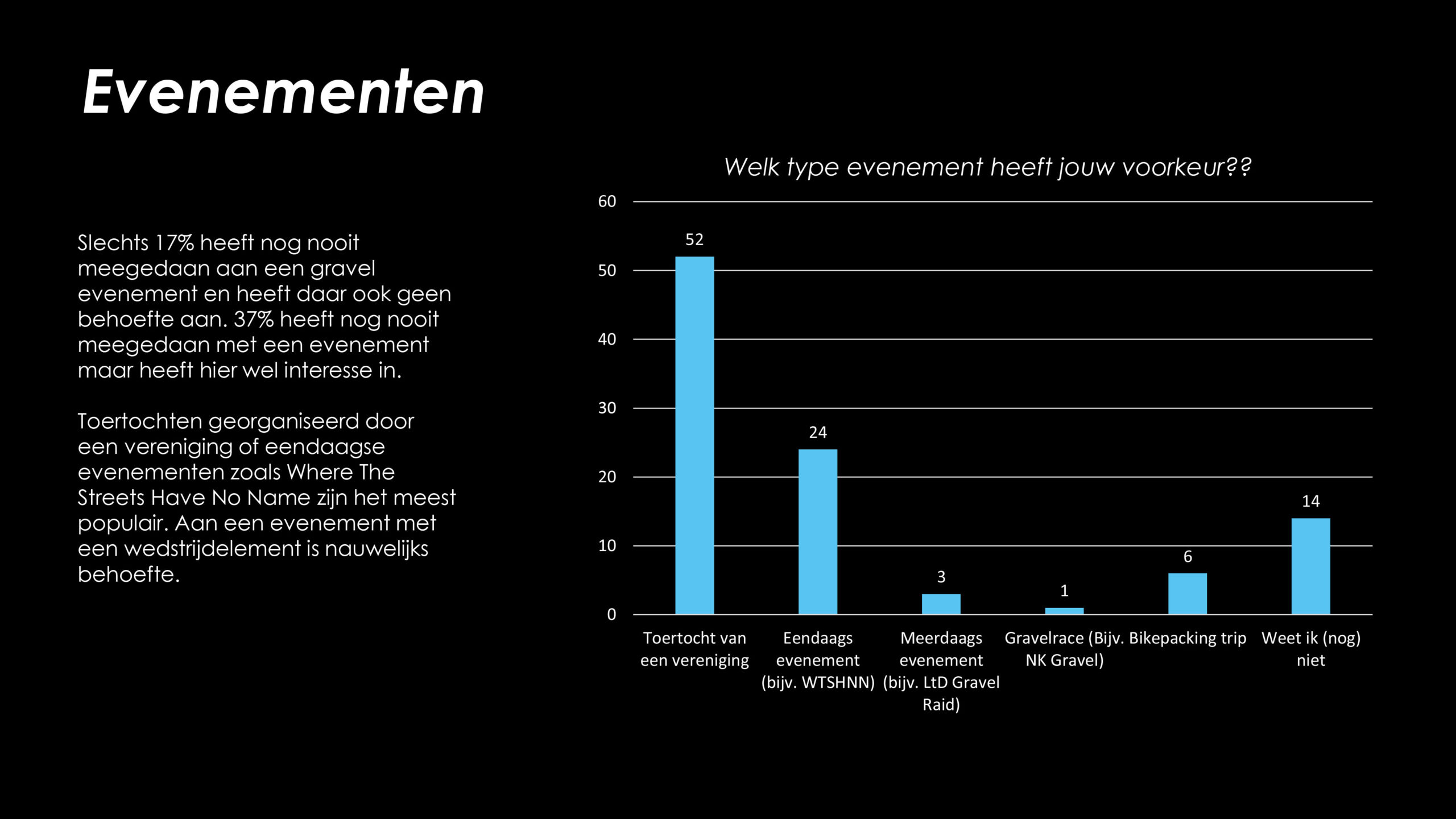 Meerdaagse evenementen zijn nog niet zo populair onder de Nederlandse gravelbikers, zo blijkt tevens. Eéndaagse tochten, georganiseerd door toerclubs/fietsverenigingen zijn dat juist wél. Maar liefst 52% van de ondervraagden geeft aan zulke graveltochten te rijden. 24% van de gravelbikers heeft interesse of nam deel aan eendaagse evenementen met beperkte deelnemersaantallen zoals Where The Streets Have No Name. Of dat het percentage een gevolg is van een lagere populariteit of juist vanwege de beperking op deelnemers, is wat lastiger vast te stellen.