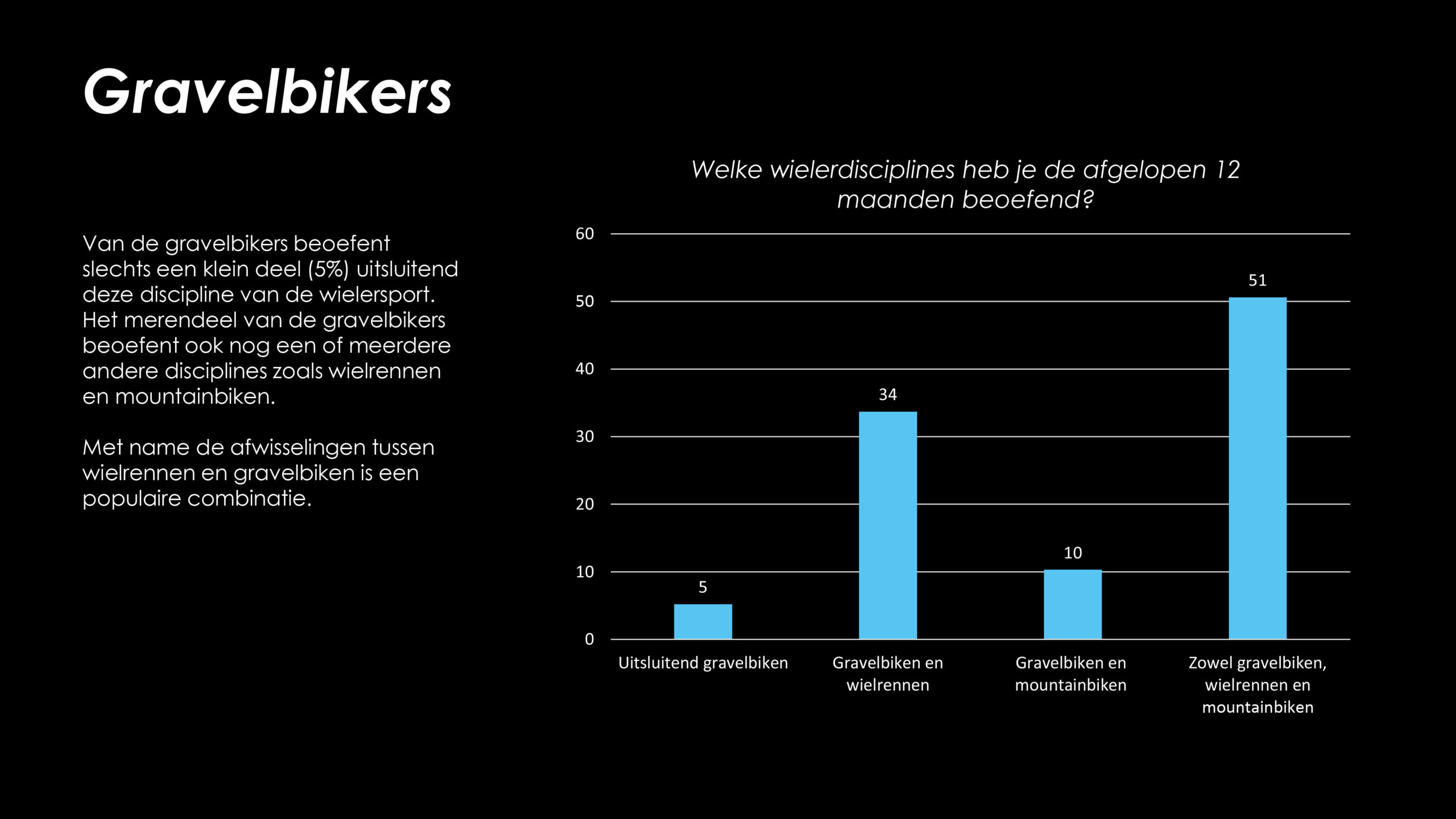 Eén van de interessantste resultaten uit het onderzoek is dat dat dé gravelbiker eigenlijk maar lastig te definiëren valt. Want veruit het grootste deel van de bikers die op een gravelbike de natuur in trekt, rijdt daarnaast ook op de racefiets en/of mountainbike. Het is met name duidelijk dat het grootste deel van de gravel-populatie vanuit het wielrennen komt.