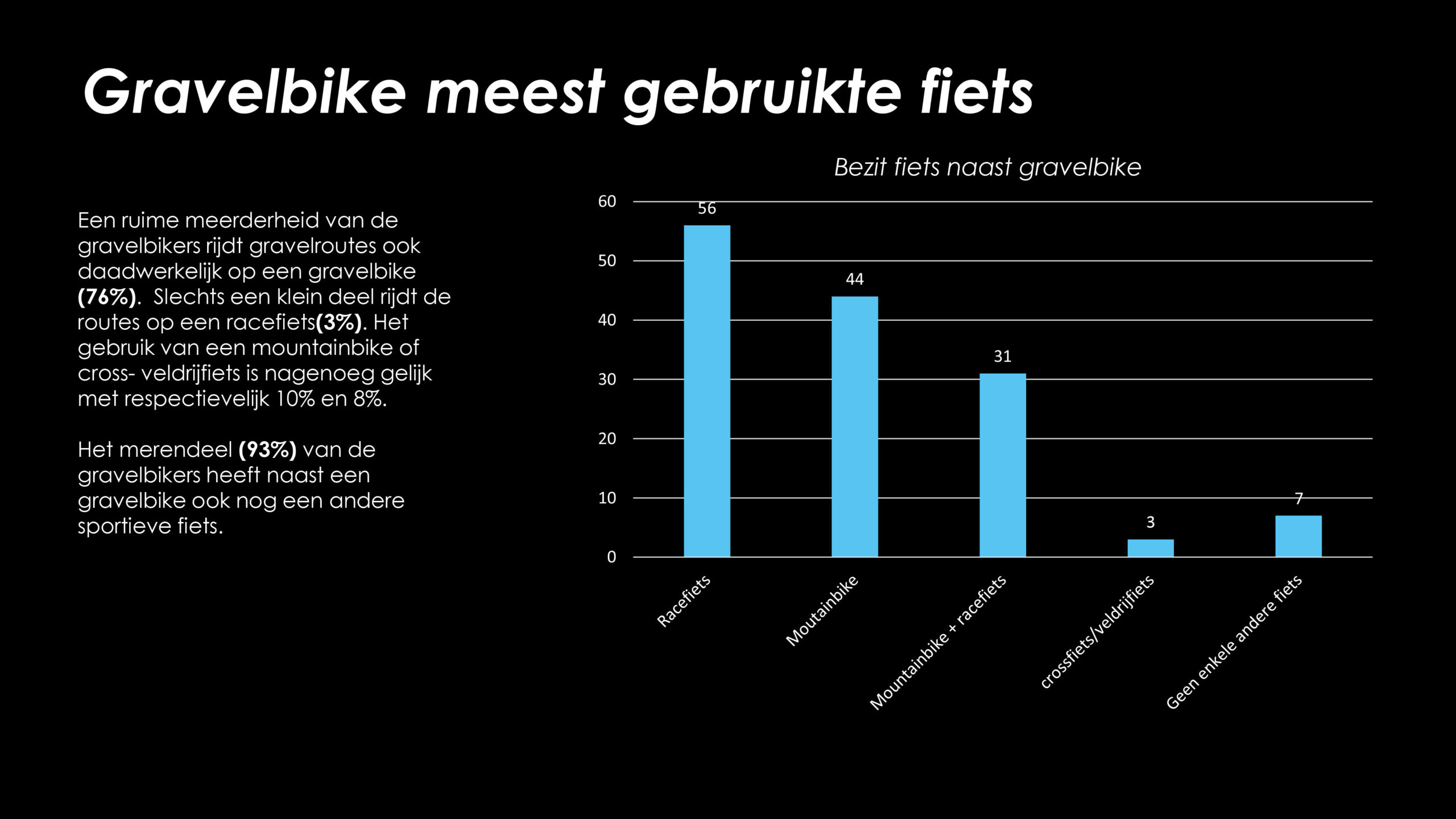 Een ruime meerderheid van die gravelbikers rijdt gravelroutes ook daadwerkelijk op een gravelbike (76%). Slechts een klein deel rijdt de routes op een racefiets (3%). Het gebruik van een mountainbike of cyclocrosser/veldrijfiets is nagenoeg gelijk met respectievelijk 10% en 8%. Bijna alle (93%) gravelaars die meededen aan dit onderzoek heeft naast een gravelbike ook nog een andere sportieve fiets. Ze fietsten vermoedelijk dus al voordat ze ook gingen gravelen.