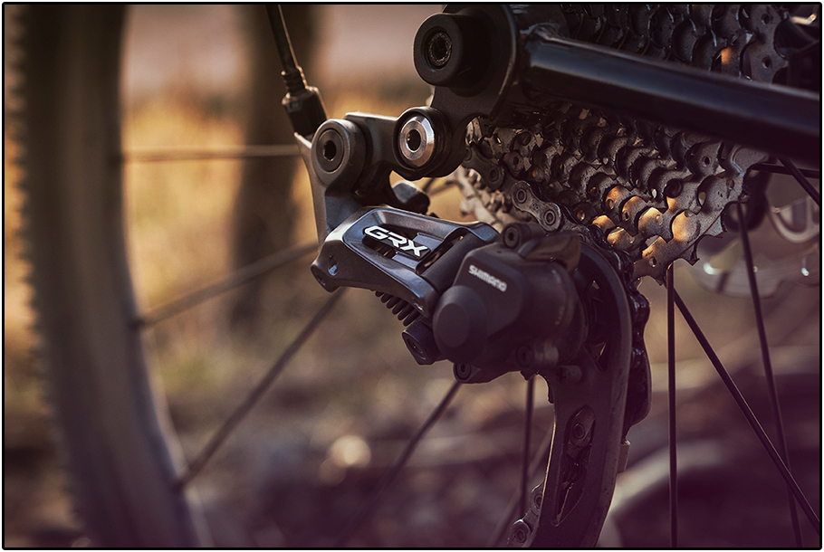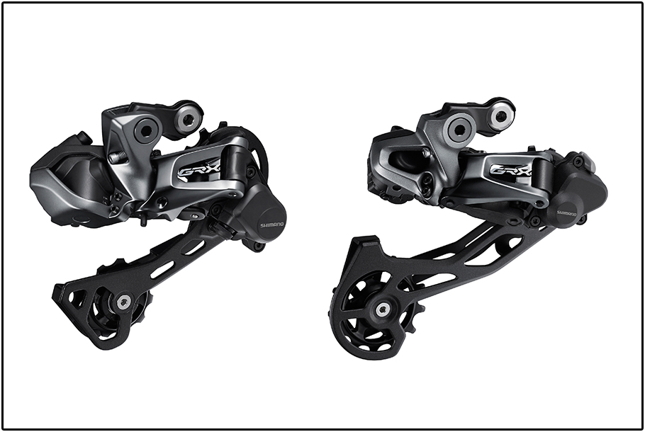 De GRX achterderailleurs bieden, buiten hun looks, feitelijk niet echt iets nieuws. Ze bouwen voort op de bekende mountainbikederailleurs en de vorig jaar geïntroduceerde Ultegra RX achterderailleur. Dat betekent voor de achterderailleurs de Shadow RD+ bouwvorm, die de derailleur méér onder het frame positioneert en daarmee zijdelings minder uitsteekt. Uiteraard zijn ze ook uitgevoerd met een clutch, die ook bij een set-up mét voorderailleur nuttig dienst doet door de hele aandrijving stiller te houden. Het topmodel achterderailleur, de RX817, kun je gerust zien als een ‘omgekatte’ XT Di2. De algehele constructie en toegepaste materialen zijn nagenoeg gelijk, alleen de looks zijn meer uh.. gravel(?).