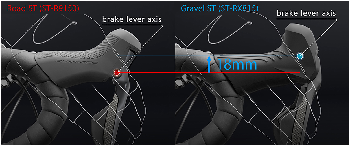 De RX815 voor de elektrische rem-/schifter is wél volledig nieuw. De ergonomie is ten opzichte van de Ultegra en Dura Ace Di2-greep veranderd. Zo komt de voorzijde iets scherper omhoog, waardoor er een duidelijkere ‘kom’ ontstaat waar je met je handpalm in of tegen aan hangt. De body is ook iets verbreed voor méér ondersteuning en de rubberen hoezen zijn anders geprofileerd om méér grip te bieden. Tot slot is de remhendel veranderd op twee punten. Ten eerste de vorm en de textuur (zoals bij de mechanische grepen) en ten tweede is het scharnierpunt 18 millimeter hoger geplaatst. In combinatie met de toepassing van het Servo Wave principe dat we van de mountainbike remhendels kennen, zou dit resulteren in méér remkracht bij een lichtere bediening.