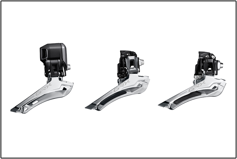 De voorderailleurs houden het midden tussen die van de mountainbike- en racefietsgroepen. Ze hebben een compacte kooi en zijn ten opzichte van de wegversies – samen met de kettinglijn – 2,5 mm naar buiten geplaatst, om zo ruimte te bieden aan achterbanden tot een breedte van 42 mm. De montage gebeurt via de racefiets-specifieke ‘aanlas’-beugel.