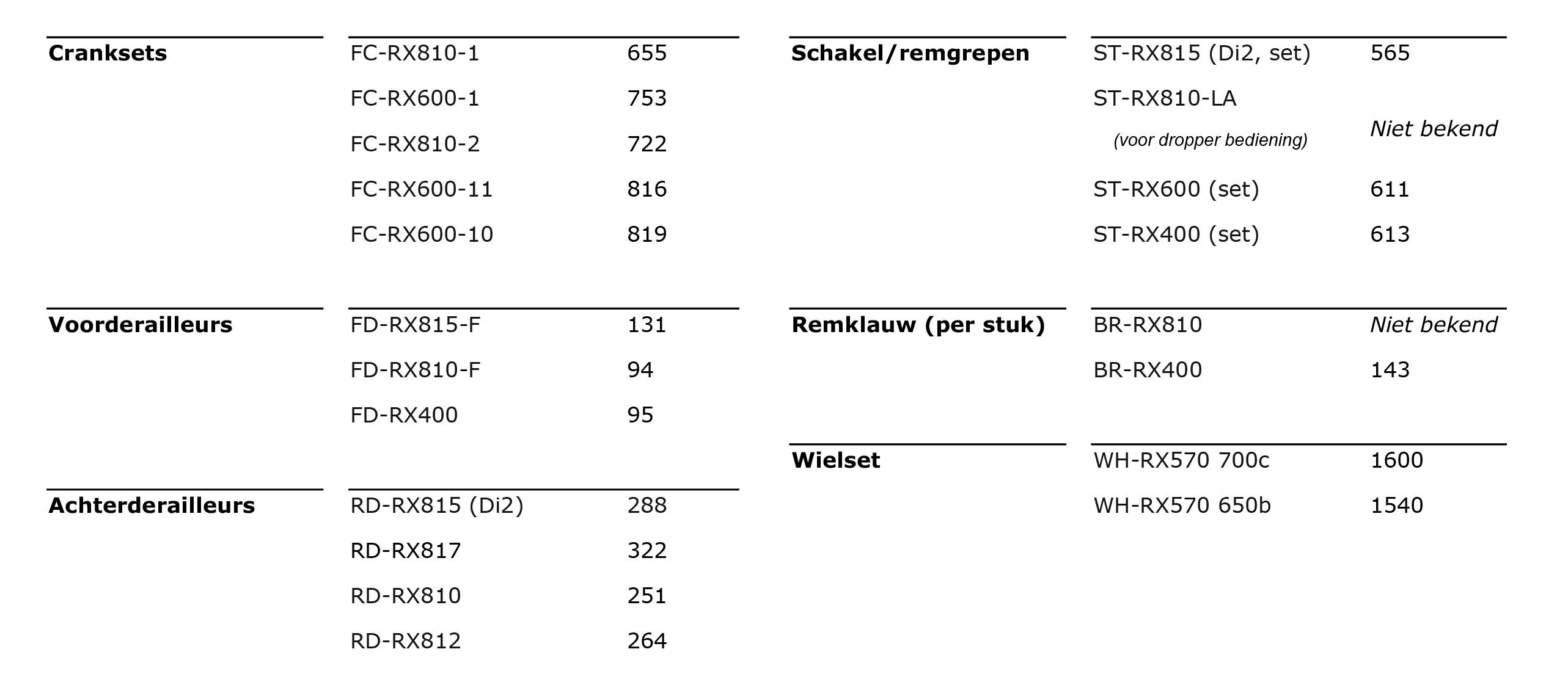 Shimano heeft bij dit persbericht wél gewichten vermeldt. Een overzicht (in grammen) van de gewichten, zover nu al bekend: