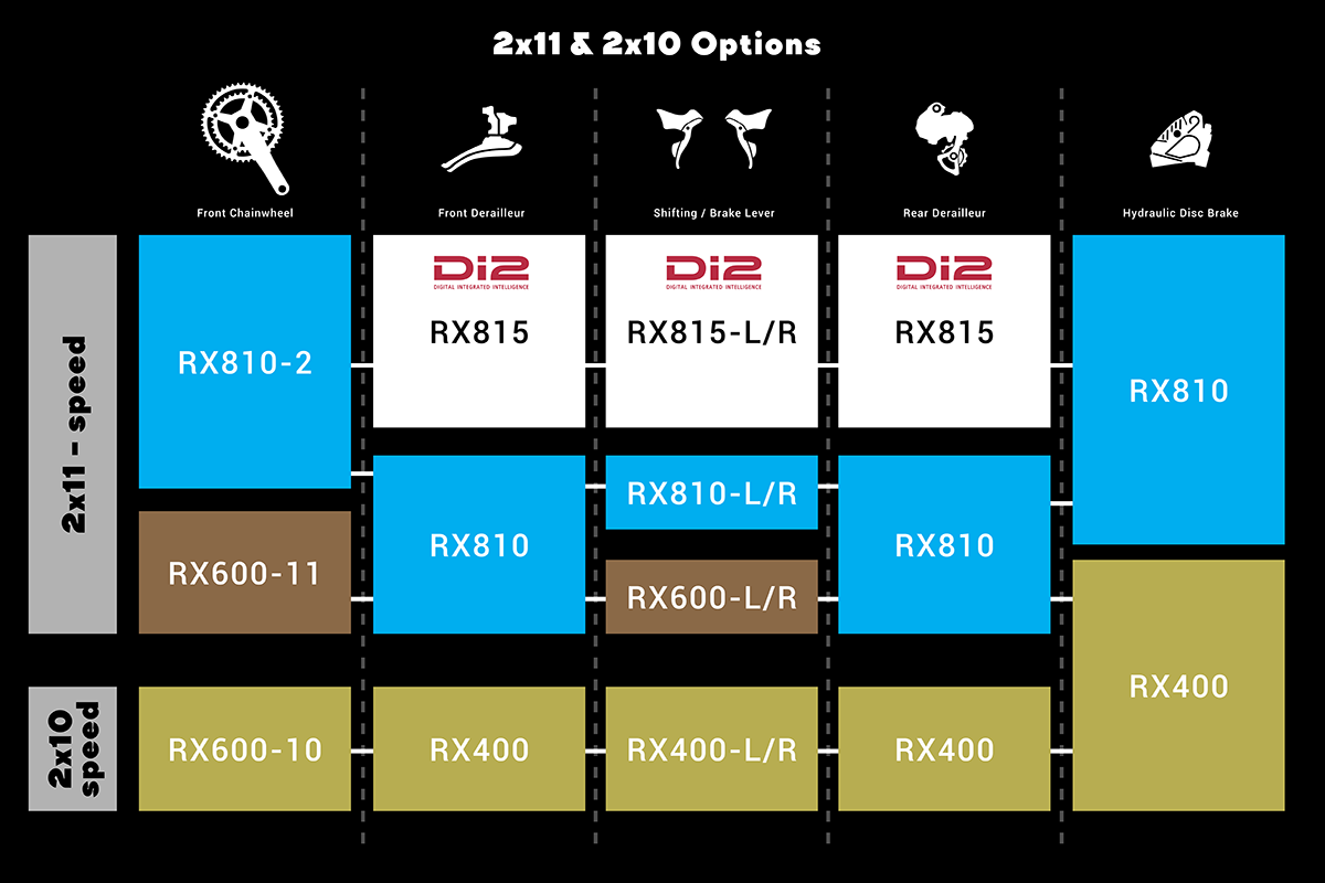 Shimano presenteert misschien wel 3 niveau’s aan gravelgroepen, maar doet dat wel met iets beperkte unieke componenten. Zo zijn er alleen voor- en achterderailleurs op RX800 niveau (mechanisch en elektrisch) en RX400 niveau (mechanisch). De cranks zijn er alleen op RX800 en RX600-niveau, terwijl de rem-/shifters juist wél op alle niveaus uitgerold worden. Het een en ander is echter wel grotendeels uitwisselbaar, waardoor er toch drie quasi volledige groepen ontstaan.