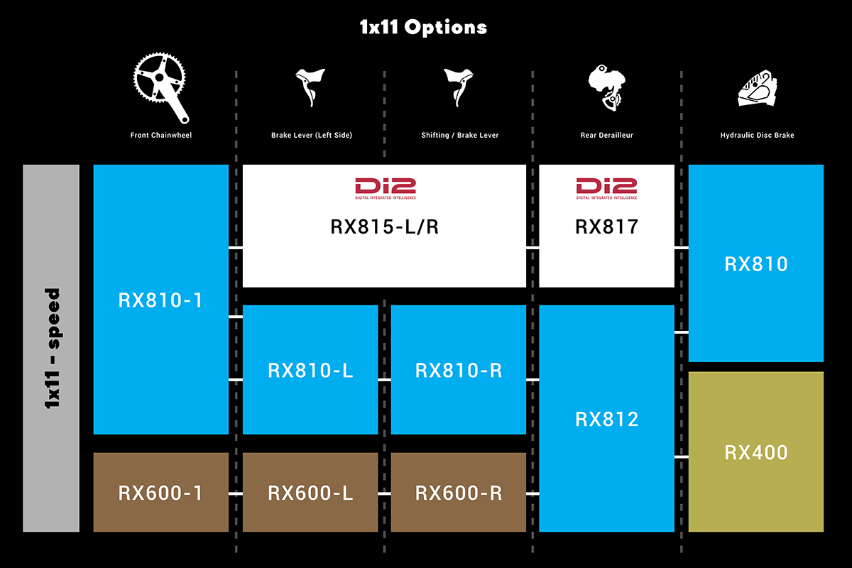- RX800: 1×11, 2×11, elektrisch en mechanisch;