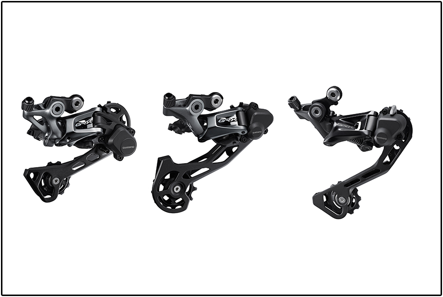 In totaal zijn er 5 achterderailleurs. De RD-RX817 en RD-RX815 zijn de Di2 11-speed versies, de RD-RX812 en RD-RX810 zijn de mechanische broers. De ’17 en ’12 zijn de versies met de kortere kooi en zijn bestemd voor one-by set-ups. De ’15 en ’10 modellen hebben een langere kooi om de grotere totale capaciteit van de set-ups mét voorderailleur aan te kunnen. De RD-RX400, tot slot, is de 10-speed achterderailleur die altijd gecombineerd wordt met de twee kettingbladen vooraan.