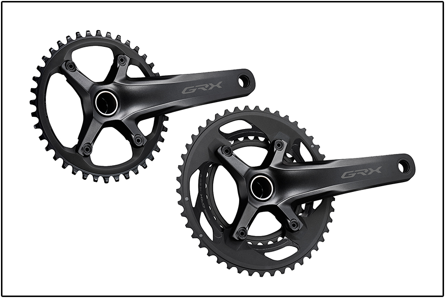 Shimano ‘gelooft’ niet in carbon cranks, dus ook voor de gravelbike krijg je bij de Japanse firma gesmede aluminium cranks. Verspreid over de drie GRX-modelreeksen voert Shimano slechts 2 gravel-specifieke cranksets: RX800 en RX600. Beide kunnen zowel met één als twee kettingbladen worden uitgevoerd. De kettinglijn bij beide typen is 2,5 mm verder naar buiten, ten opzichte van de racefietsgroepsets, om dus ruimte te maken voor brede banden.