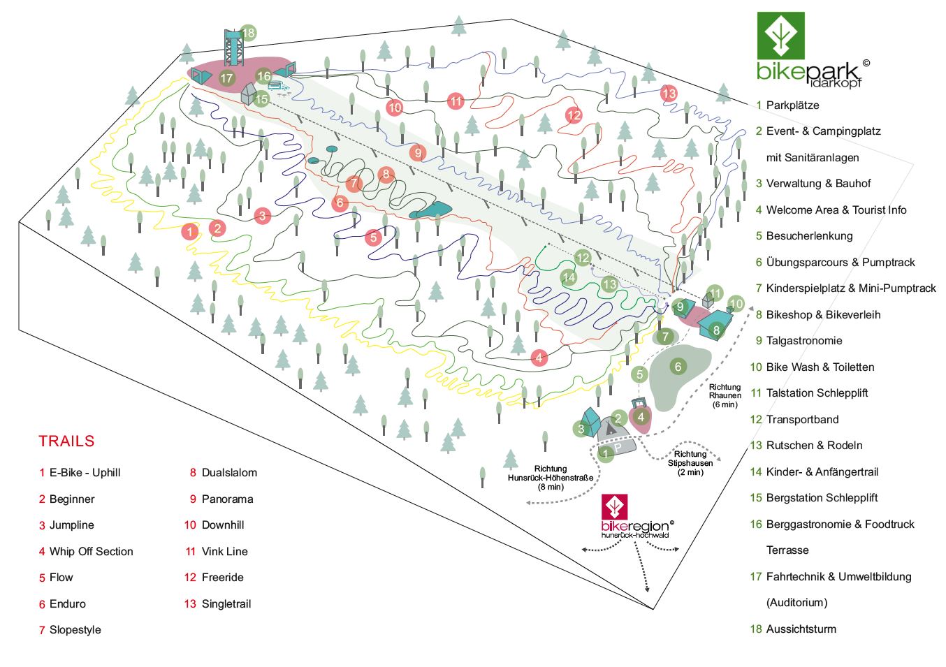 De Idarkopf, met 745 meter één van de hoogste bergen van het Hunsrückgebergte in Duitsland, is bij de wat ouderen onder ons waarschijnlijk wel bekend als skigebied. Het gebied – op zo’n 2,5 uur rijden ten zuidoosten van Maastricht – kent een rijke historie in de afgelopen 40 jaar. De laatste jaren is de sneeuw in deze regio schaars en was er nauwelijks nog sprake van een ‘skigebied’: faciliteiten werden dus gesloten. Voorafgaande aan de sluiting is nog overwogen om een skihal aan te leggen, maar met een geschatte investering van 170 miljoen Euro is dat project afgeblazen. Vervolgens is men op zoek gegaan naar een nieuwe bestemming voor het gebied. Nico Reuter, woonachtig in dit gebied, zag zijn kans schoon. Als skiër zette hij hier zijn eerste schreden op de lange latten. Nu is hij fanatiek gravityrijder en heeft een ingenieursbureau, waarmee hij een bikepark wil realiseren. De omliggende gemeentes, als eigenaren van de gronden, zijn in elk geval al om. Ze hebben het beoogde terrein voor de komende 40 jaar verpacht aan de nieuwe bikepark-organisatie.