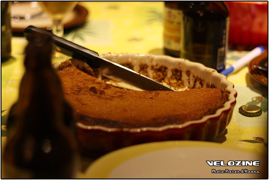 Na mijn rit stap ik met gemengde gevoelens binnen bij Dave en het duurt even om te acclimatiseren na de anticlimax die de terugreis me heeft opgeleverd. Mijn negatieve gedachten verdwijnen echter als sneeuw voor de zon als Tom arriveert met verse frites, snacks en – jawel – een selectie zeer fijne biertjes. Iedereen neemt plaats aan tafel en als hongerige wolven storten we ons op de welverdiende berg gefrituurde lekkernijen, terwijl er gezellig wordt nagepraat gaan de biertjes de tafel rond. Hier geen gênante vertoningen maar een post-race after party in stijl! (… en met gewoon een porseleinen wc-pot, in plaats van voortuin- urinoir…)