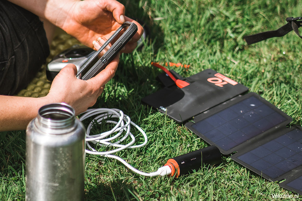 De Knog PWR Solar bestaat uit vier zonnepanelen en een powerbank, die in opgevouwen toestand een plat doosje vormen van 17,5 cm x 10,5 cm x 3,5 cm en een gewicht van 450 gram. Beste een hoop extra grammen als je van de afgezaagde tandenborstelbrigade bent, maar dat is wat verbondenheid met het wereldwijde web nou eenmaal kost, qua grammen extra in je fietstas of rugzak. Het opgevouwen geheel sluit met magneten en diezelfde magneten kun je ook gebruiken om de zonnepanelen op te hangen. De buitenzijde is voorzien van een sterke coating die bestand is tegen warmte, water, olie en zouten. Vier LED-jes geven aan in welke positie de panelen het meest efficiënt werken. Volgens Knog zijn de zonnecellen zelf ook de beste die je kunt krijgen. “De Sunpower Maxeon Gen 5-cellen worden ook door NASA gebruikt”, zeggen ze. Naast telefoon of gps kun je met de Knog PWR Solar ook de externe powerbanks van Knog opladen.