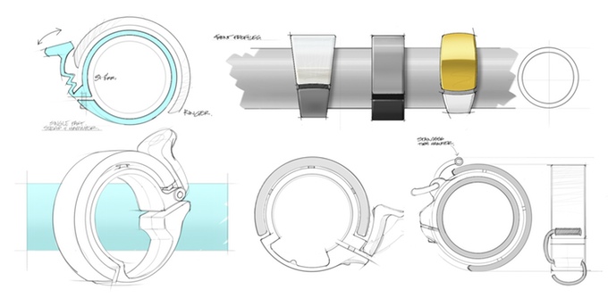 Het resultaat is even elegant als doordacht. Een minimalistisch uitgevoerde kunststof klem – beschikbaar in ‘small’ (22,2 mm diameter) of ‘large’ (25,4-31,8 mm) – past direct om het stuur. Om die klem heen zit een metalen ring die de traditionele bel-vorm vervangt. Deze ring is van aluminium óf titanium. De aluminium versie is ook verkrijgbaar in het zwart of met een brons- of koperlaag.
