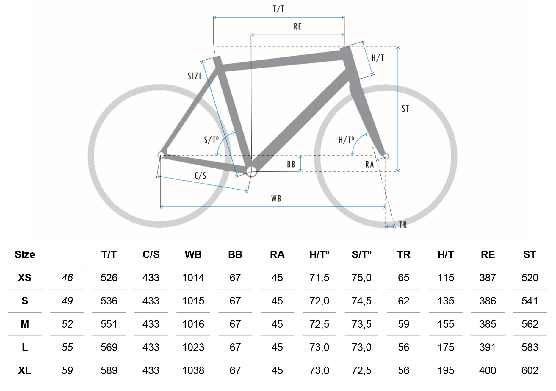 De Colmaro Allroad LTD is er in 5 maten. Opvallend is dat de XS, S en M nagenoeg dezelfde wielbasis hebben. Dat is bij met name de XS en S ongetwijfeld gedaan om de toe-overlap met het voorwiel te verminderen. En ook al zet Koga de Colmaro als een gravelracer neer, de trapas staat lang niet zo laag als bij sommige andere ‘racers. Combineer dat echter weer met de betrekkelijk korte naloop (‘TR’ in de onderstaande tabel) en de Colmaro zal beslist ‘sportief’ rijgedrag geven.