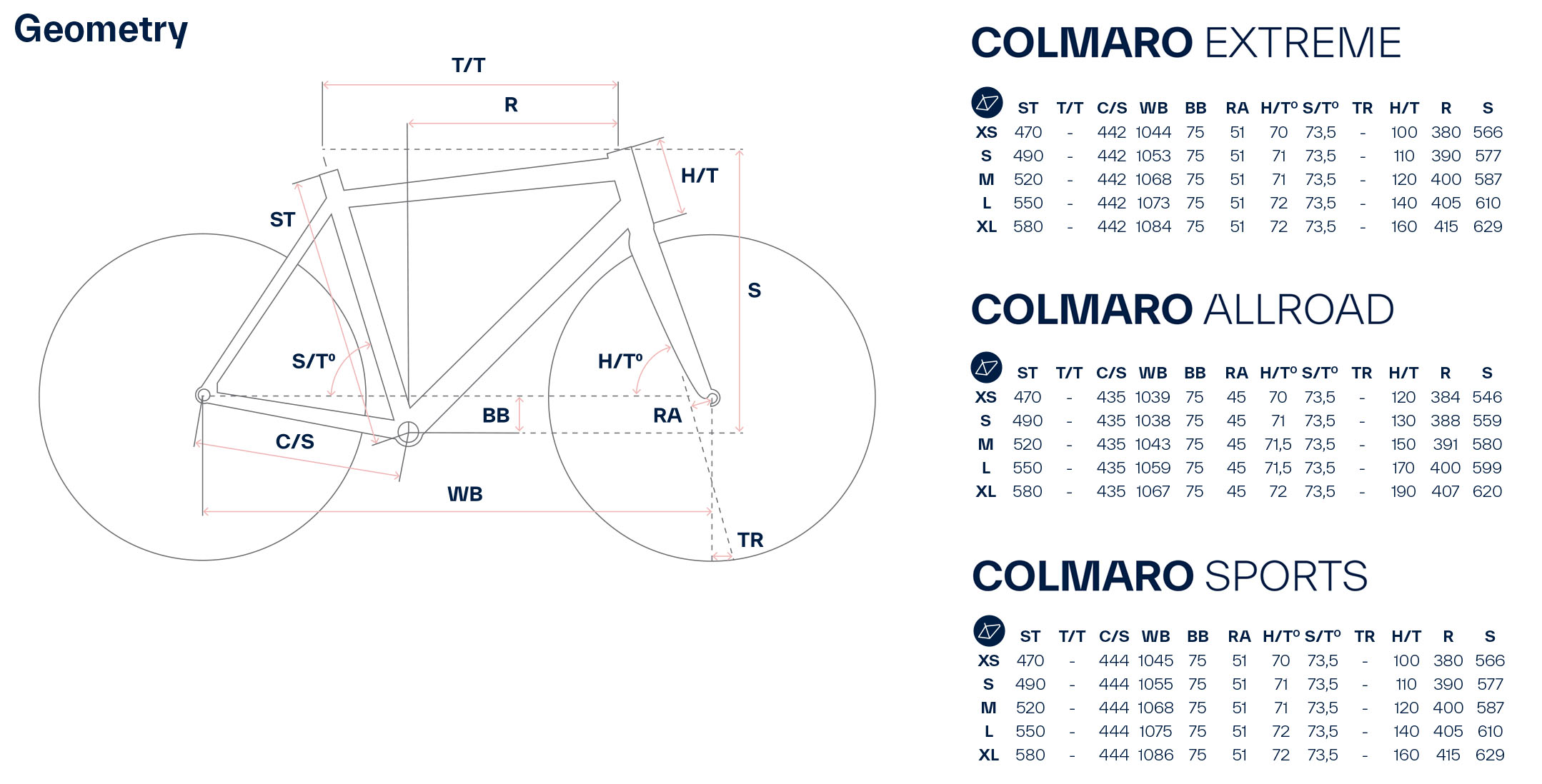Enigszins opvallend is dat Koga in de basis drie verschillende frames maakt. Men had voor zowel de Colmaro Extreme, Allroad én Sports allemaal dezelfde geometrie kunnen kiezen, maar klaarblijkelijk maken ze zich er in Heerenveen er niet zo gemakkelijk vanaf. Zo heeft de Colmaro Extreme ten opzichte van de Allroad per framemaat een kortere balhoofdbuis om ruimte te bieden aan de hogere inbouwlengte van de geveerde voorvork. In dat opzicht is de Colmaro Allroad niet simpelweg een Extreme met een starre carbon voorvork. En vervolgens wijkt ook de Colmaro Sports weer af van de Allroad.