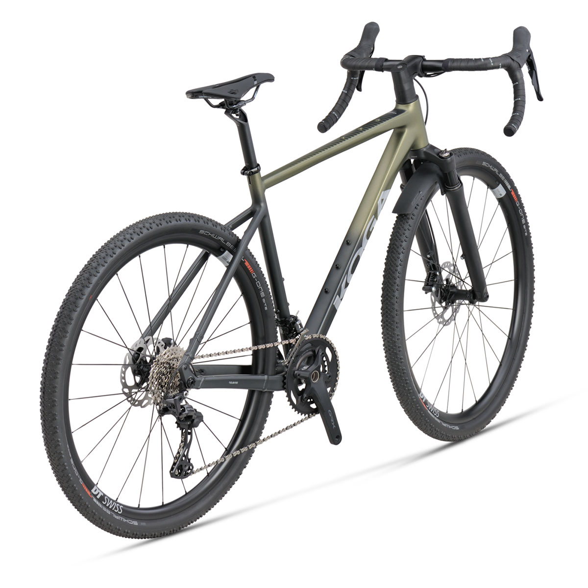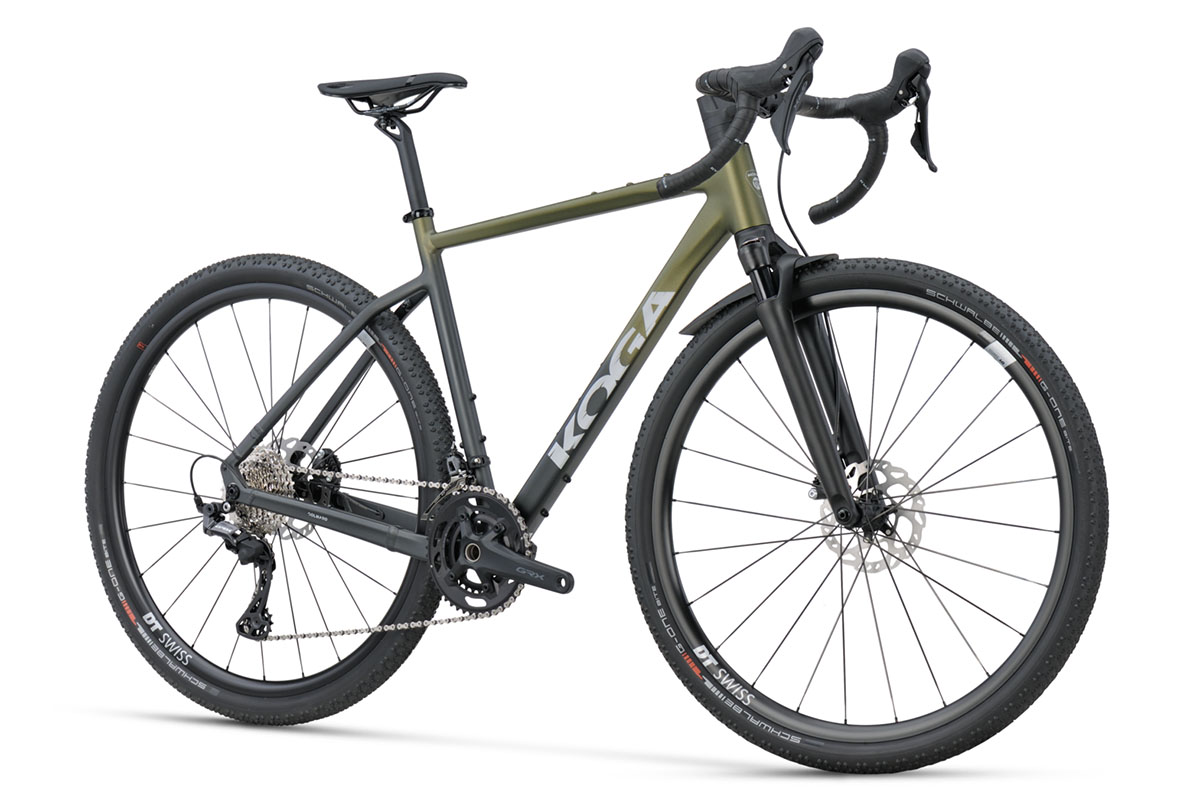 Het topmodel van Koga’s gravelbikefamilie is de Colmaro Extreme Anniversary Edition. Koga bestaat namelijk vijftig jaar en viert dat onder meer met een gelimiteerde versie van z’n nieuwste gravelbike. Er worden maar 50 stuks gebouwd, herkenbaar aan de gouden accenten en de semi-draadloze Shimano GRX Di2 2×12-speed aandrijving. Verder komt deze Colmare Extreme AE met een geveerde Suntour GVX32-voorvork met 40 millimeter veerweg. De 50 millimeter brede Schwalbe G-One Bite-banden zijn gemonteerd op carbon wielen uit eigen huis. Deze gelimiteerde versie kost 4.499 euro.