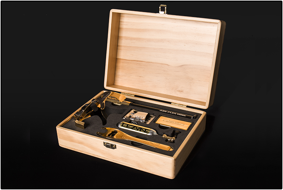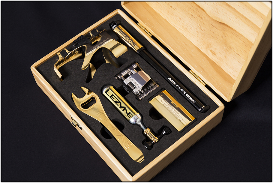 Heb je een dertiende maand, of sowieso geld ‘over’… én hou je van goud? Dan wil Lezyne best wel wat van jouw geld ruilen tegen wat goud spul! Geleverd in een houten kistje krijg je zes Lezyne nuttigheden, of zoals ze het zelf trendy noemen ‘essentials’, die stuk voor stuk zijn verguld. Heel nuttig, uiteraard. Vooral als je goede sier wilt maken bij je fietsvrienden die het met ordinair geanodiseerd aluminium moeten stellen, de stumpers.