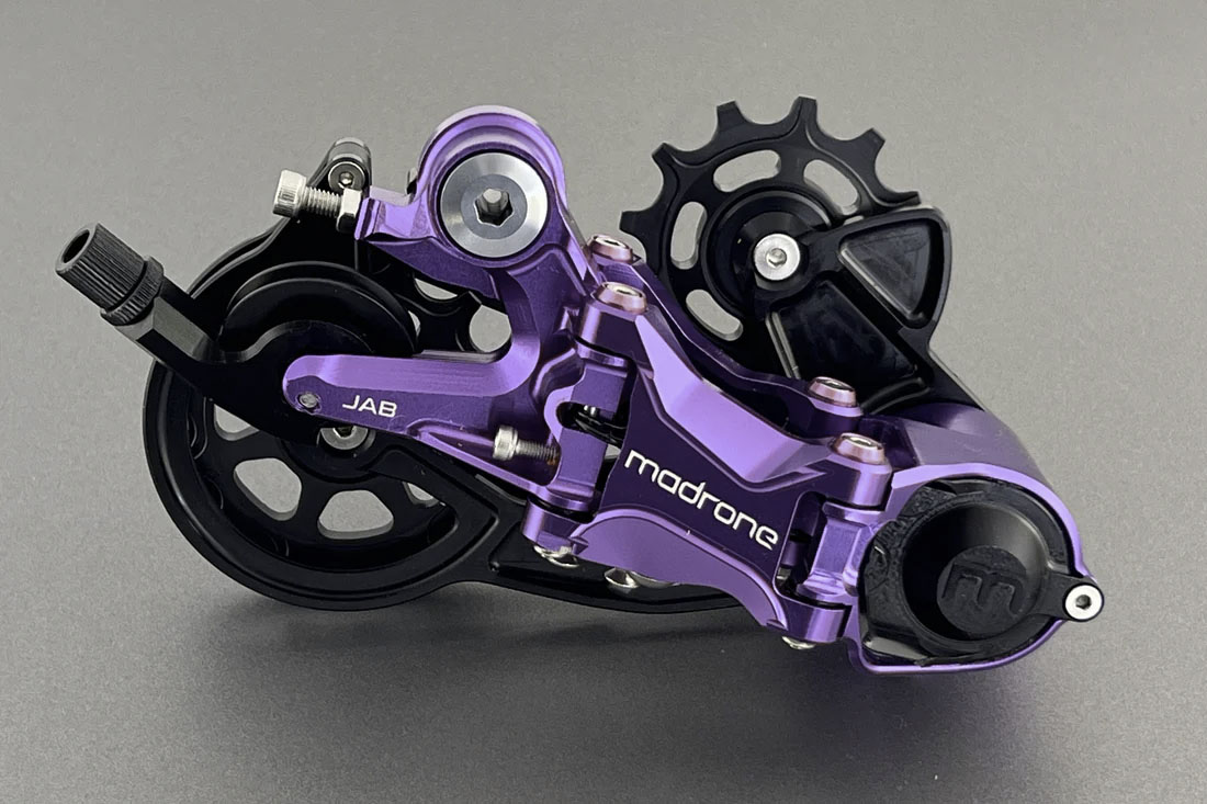 Je stelt de Madrone Jab-derailleur niet alleen qua schakelopties naar wens samen, ook qua kleur. Zo heb je de keuze uit grijs, zwart, blauw en paars voor de geanodiseerde aluminium delen. De kooi en de derailleurwieltjes zijn er vooralsnog alleen zwart geanodiseerd. Je hebt een Madrone Jab-derailleur vanaf circa 324 euro exclusief verzendkosten. Qua levertijd moet je rekenen op enkele weken. Losse onderdelen zijn uiteraard later afzonderlijk te bestellen, zodat je de derailleur in de toekomst eenvoudig kunt onderhouden of aanpassen aan een andere aandrijving.