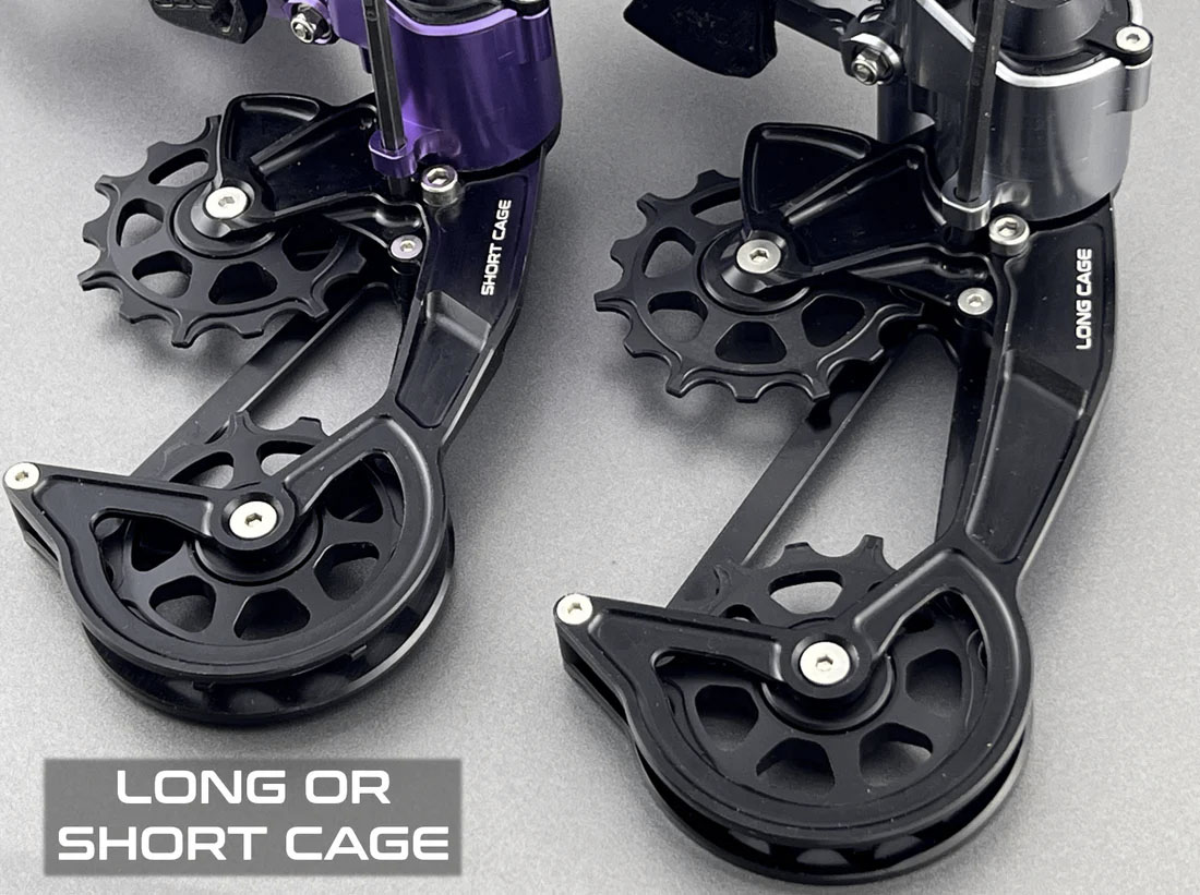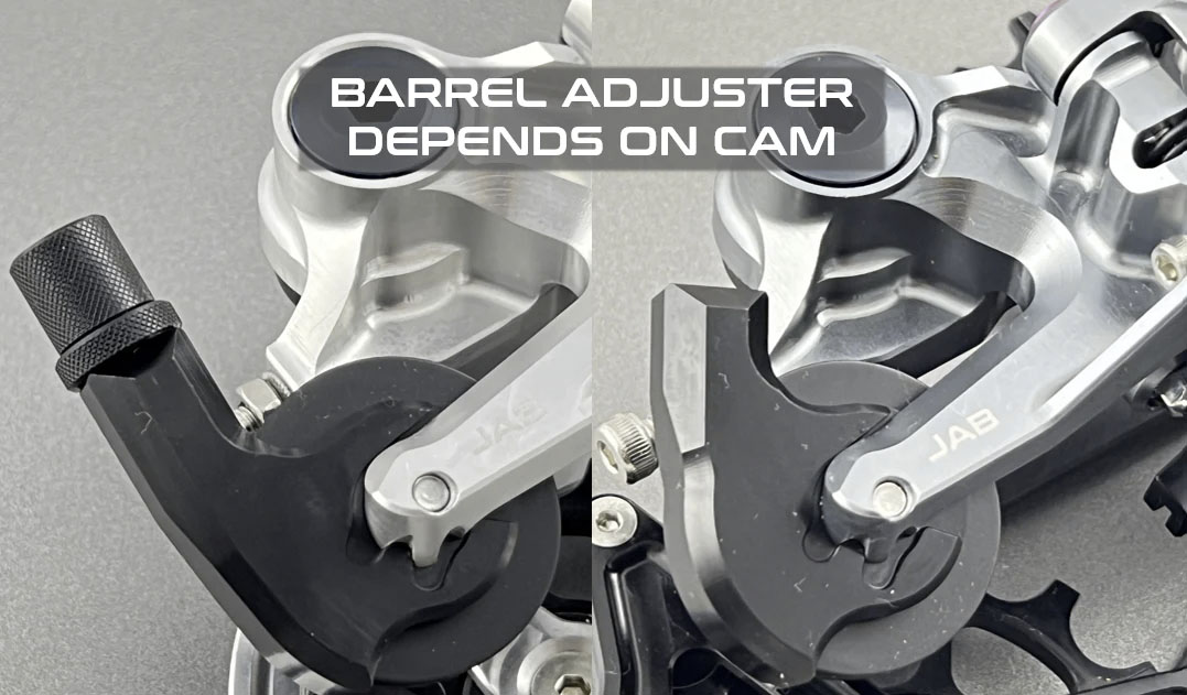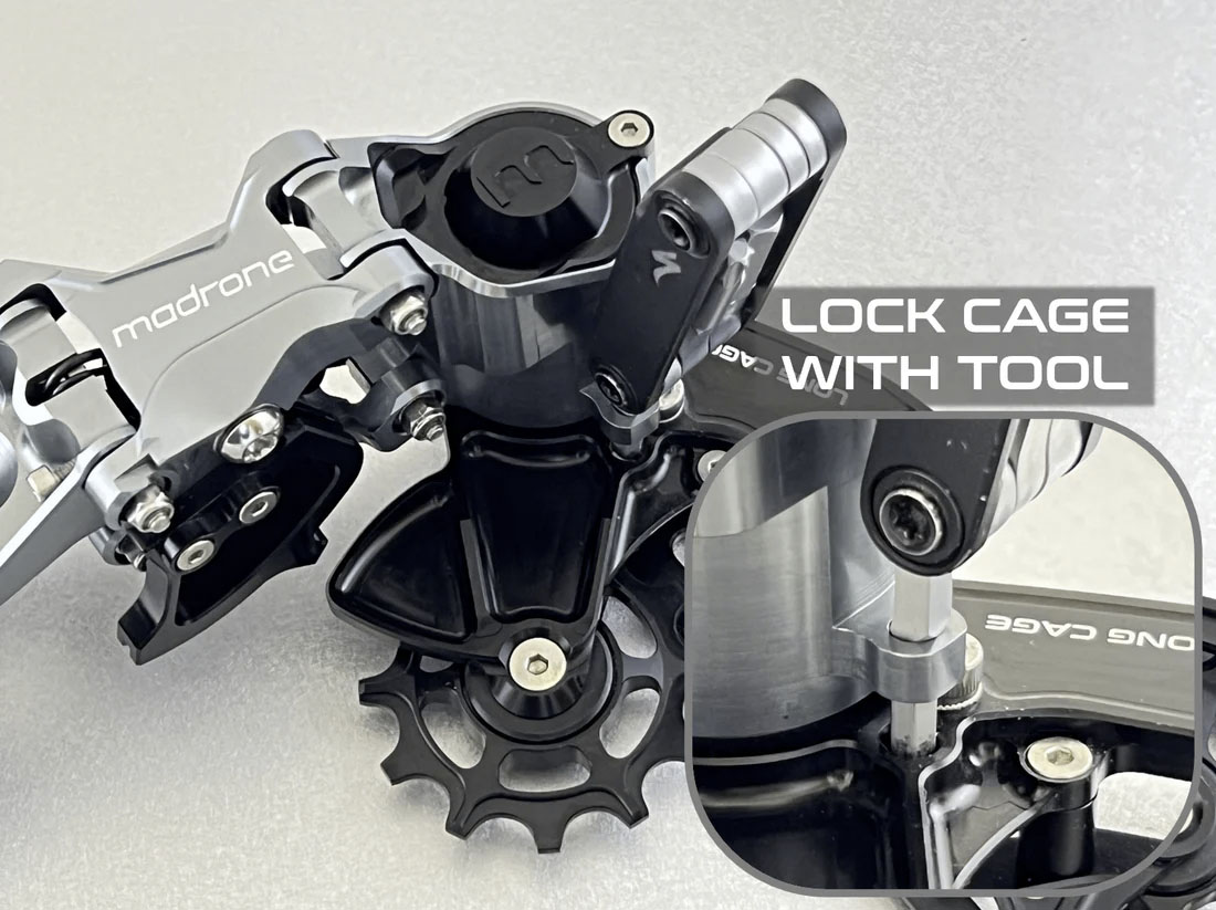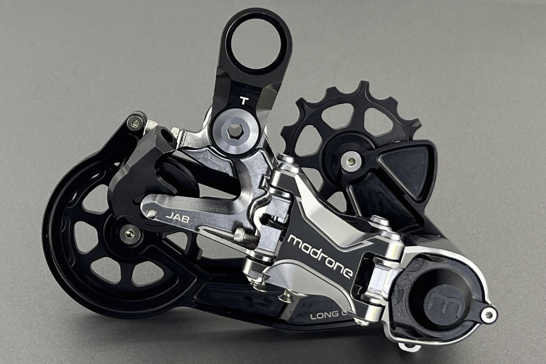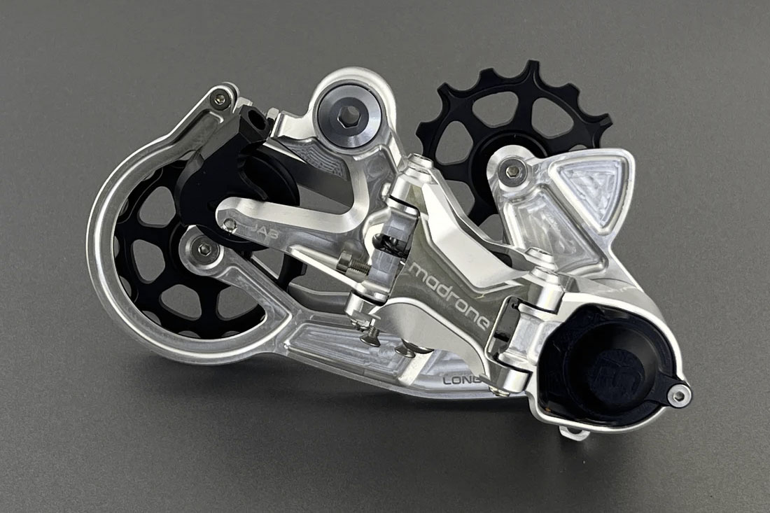 De Madrone Jab is volledig zelf samen te stellen, waarbij je diverse opties hebt. Zo zijn er korte en lange kooien, waarmee Shimano- en Sram-cassettes van 11- tot 12-speed met een semi-compact bereik (40t als grootste krans) tot een groot bereik (52t als grootste krans) geschakeld kunnen worden. Verder is de Madrone Jab verkrijgbaar met diverse cable cams of, vrij vertaald, kabelnokprofielen. Ontwerper Bland heeft zich diepgaand verdiept in de kabeltrekratio’s van de meest courante Shimano- en Sram‑schakelaars, voor zowel mountainbike- als gravelbikeconfiguraties. En middels de verschillende kabelnokprofielen is de Jab dan dus geschikt te maken om te werken met uiteenlopende combinaties van cassettes en schakelaars.