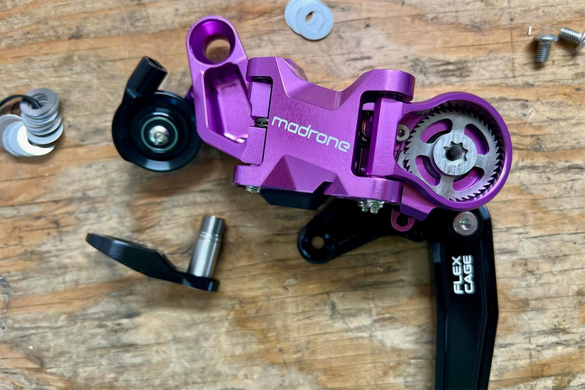 De Madrone Jab derailleur weegt 280 gram (lange kooi) en gaat uiteindelijk 349 euro kosten. Dat is niet niks voor een mechanische derailleur, maar voor een relatieve exoot die je vervolgens gemakkelijk een langer leven kunt geven met reserveonderdelen, is dat best scherp.