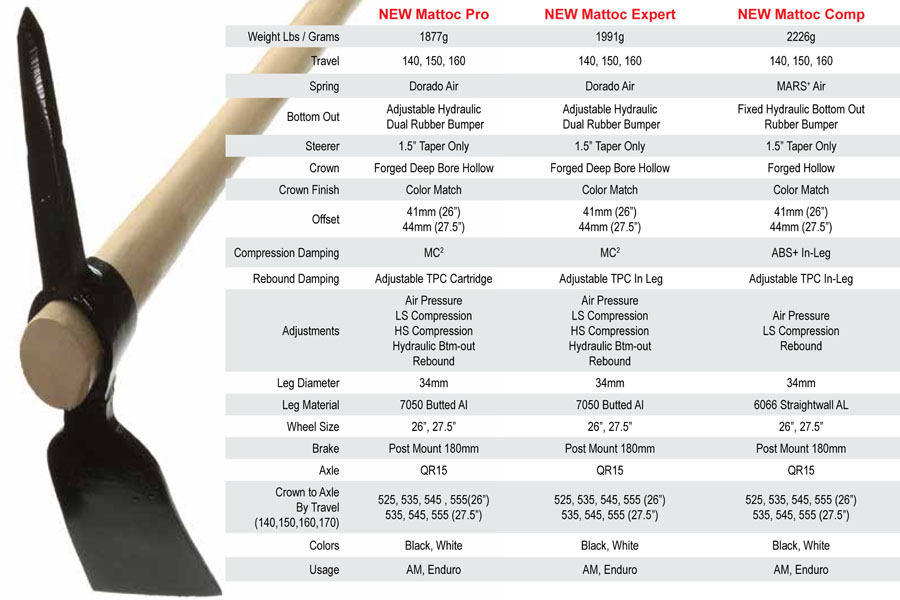 De Mattoc is een vork bestemd voor het internationaal meest populaire segment momenteel; all-mountain. De vork is voorzien van 34 mm binnenpoten en komt met 140, 150 en 160 mm veerweg voor 26″ en 27,5″ wielen. Een versie met 170 mm veerweg voor 26″ wielen zal ook leverbaar zijn. Het verstellen van de veerweg kan intern simpelweg door het toevoegen of uitnemen van spacers.