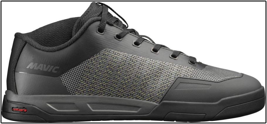 Naast wielen is Mavic inmiddels ook goed bekend van kleding en schoenen. Die lijn blijft groeien sinds de overname door Salomon en later de Amer Sports groep. Er komen op z’n minst 8 nieuwe modellen schoenen bij, waaronder twee modellen voor platform pedalen. De Deemax Pro Flat en Deemax Elite Flat zijn voorzien van Contagrip buitenzolen voor extra grip, maar zonder uitsparing voor schoenplaatjes. Bedoeld voor het lompste terrein bieden beide schoenen extra bescherming tegen stoten voor zowel hiel als tenen. Het €170,- kostend Pro model is ook voorzien van enkelbescherming en Matryx stof, die door gebruik van Kevlar beter tegen de onvermijdelijke stootjes moet kunnen. Gewichten zijn 350 g (Pro) en 365 g (Elite) per schoen in maat 42. Het Elite model kost €120,-.