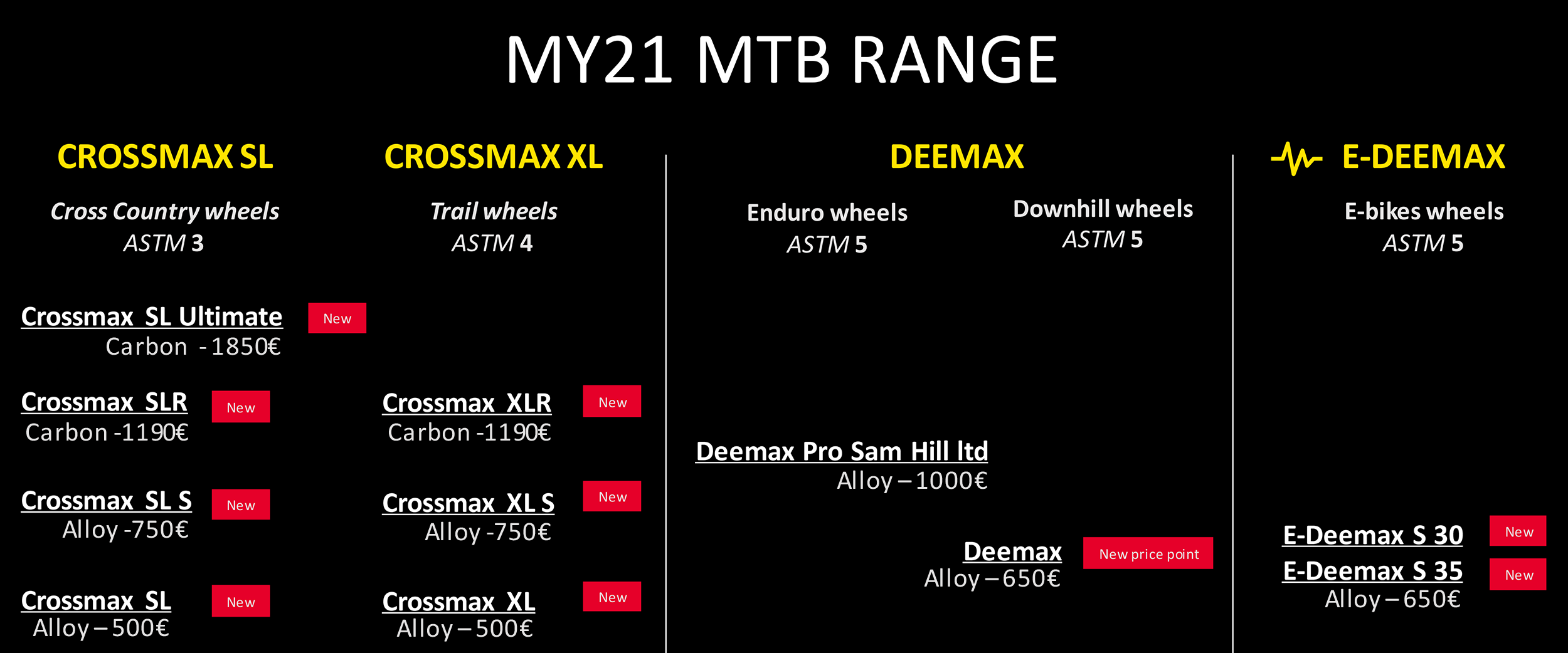 In de voorbije periode maakten we al kennis met de vernieuwde carbon en aluminium wielsets voor cross country, trail, enduro en downhill. En met die nieuwe producten heeft Mavic meer uniformiteit in de naamstructuur én prijsstelling aangebracht. Het volledige programma laat zich nu als volgt samenvatten: