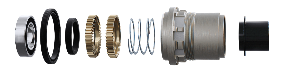 Voor de vrijloop blijft Mavic bij hun ID360-principe, bestaande uit twee getande ringen die axiaal in elkaar grijpen om de trapkracht door te geven. Het bekende recept dat veel merken toepassen. Echter, bij Mavic kun je door het monteren of wegnemen van een demper het geluidsvolume tijdens vrijlopen beïnvloeden. Bij deze ID360 vrijloop heb je tot slot nog de keuze uit een Sram XD, Shimano Microspline en 11-speed Shimano cassettepassingen.