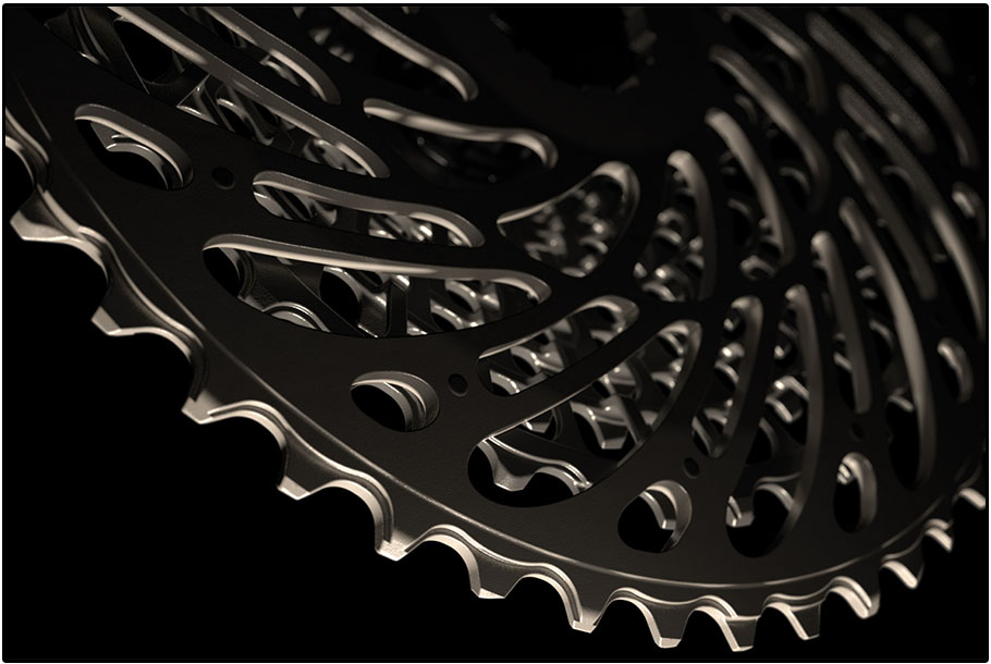 Ook hier is enkel het grootste kettingblad uit aluminium vervaardigd. De rest is uit één stuk staal CNC gedraaid en gefreesd. Dat geldt dus ook voor de 42t tandenkrans die voorheen wél uit aluminium was. Eén krans extra en dus ook één krans meer in staal komt tegen een prijs: het gewicht. De 11 speed XG1199 woog 265 gram; de nieuwe 12 speed variant weegt met 355 gram maar liefst 90 gram méér!