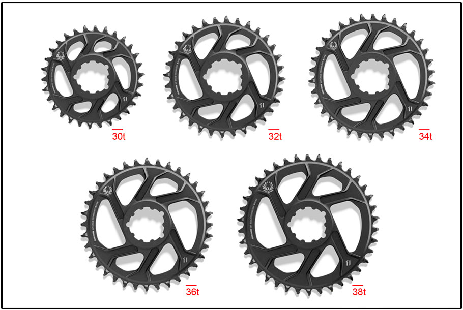 Vooralsnog lanceert SRAM enkel Direct Mount X-Sync 2 kettingbladen. Opvallend genoeg telt het kleinste kettingblad 30 tanden, waar dat bij de ‘gewone’ XX1 26 tanden betrof. De reden lijkt logisch: 26 tanden in combinatie met de 42 achteraan geeft een ratio van 0,6. 30 tanden vooraan in combinatie met de nieuwe krans met 50 tanden in de 12 speed cassette geeft, juist, óók een ratio van 0,6 en in de praktijk is dat erg licht.