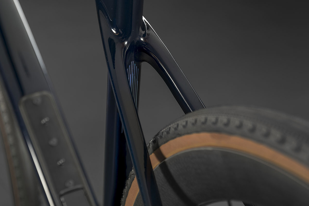 Oogjes voor dragers of tassen op het frame of voorvork van de Mission zoek je tevergeefs. De onderbuis heeft weliswaar een opbergvak, maar dat is voor energiereepjes, een reservebandje en gereedschap; niet voor een arsenaal aan campingartikelen. De Mission komt uitsluitend met Merida’s CF4-carbon, heeft aerodynamische buizen, (bij de drie duurste versies) een geïntegreerde cockpit en biedt maximaal ruimte aan banden met een breedte van 40 millimeter. Merida zet de Mission dus expliciet neer als gravelracer. Een toch wel opvallende keuze; bij gravelracers is er duidelijk een trend naar breder rubber. En echt niet alleen bij Amerikaanse gravelracers.