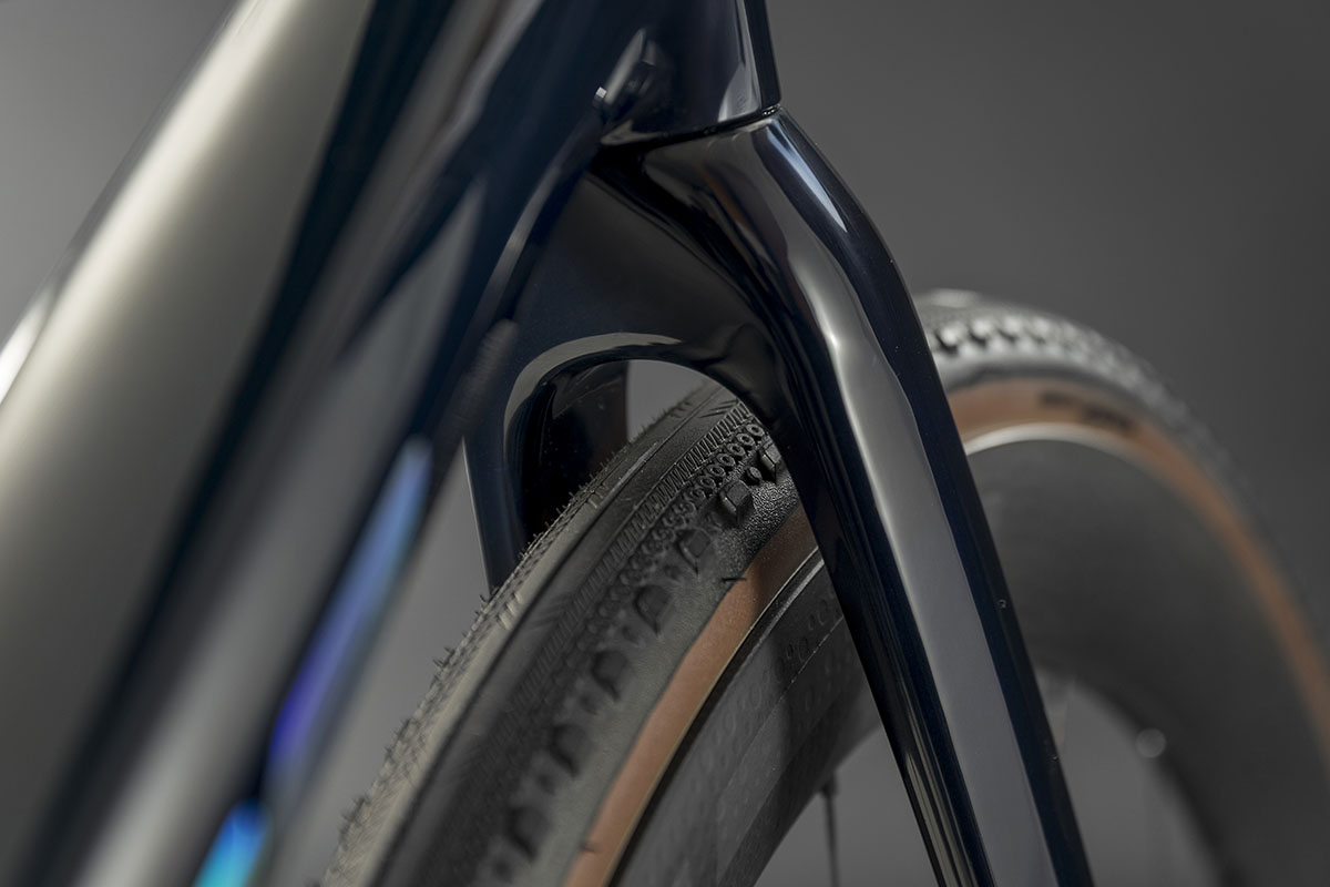 Merida geeft verder weinig duiding over de keuze, behalve dat ze het als het perfecte midden zien tussen de 35 en 45 millimeter bandbreedte bij respectievelijk de Scultura Endurance GR en de Silex. Numeriek is dat in elk geval een steekhoudend argument. Maar toch voelt het ergens al gedateerd en zal het waarschijnlijk nog wel wat wenkbrauw doen fronzen in de showroom. Verder refereert Merida wel aan het samenspel met de stroomlijn. Daarin zou je dus ook kunnen lezen dat ze bredere banden op dat punt als een te groot compromis zien.