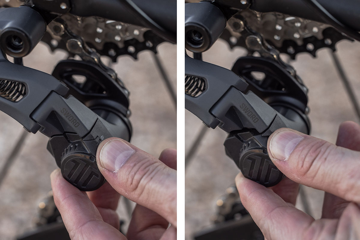 Voor elk van de opstellingen heeft Microshift een specifiek Sword-achterderailleur. De RD-G7005M is gemaakt voor de 1x-setup. De RD-G7005L heeft een langere kettingkooi, om met het grotere bereik van de 2x-setups uit de voeten te kunnen. Verder zijn beide derailleurs gelijk. Dat betekent dat ze dezelfde ratchet clutch hebben om de kooi te dempen. Ten opzichte van eerdere versies die Microshift al toepaste, zou de versie in de Sword-derailleurs nu stiller zijn. Via een draaiknop aan de buitenzijde zet je de clutch uit om een wielwissel te vergemakkelijken. De kabelversteller achterop de derailleur kan rondom 15 graden kantelen. Hierdoor kan de versnellingskabel altijd het meest gunstige pad met de minste weerstand aannemen, zo claimt de Taiwanese fabrikant. Tot slot is het nog vermeldenswaardig dat de kooi vervangbaar is. Rijdt je hem krom of wil je van je 1x-aandrijflijn toch een 2x-aandrijflijn maken, dan kun je hem dus gemakkelijk vervangen.