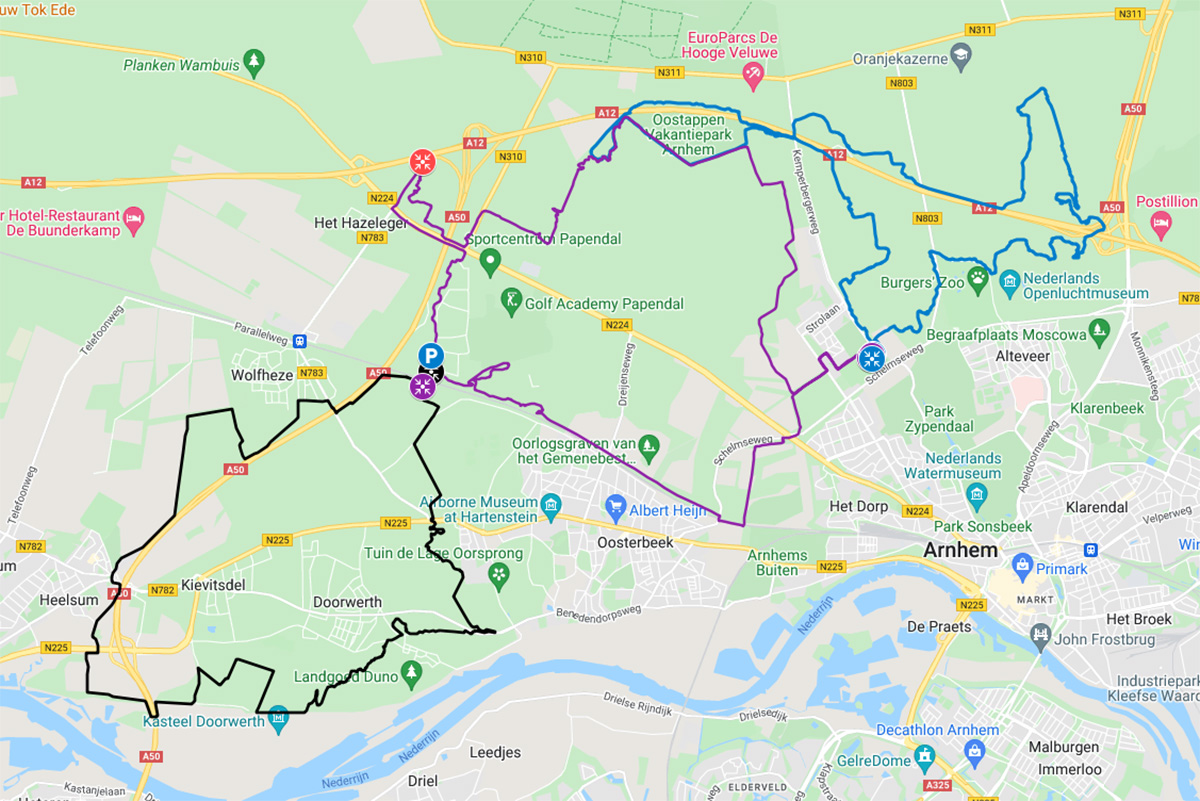 - Arnhem (paars): Dit is de nieuwe naam voor de sterk verbeterde noordelijke los van de Oosterbeekroute. Hij is 15 kilometer lang, en doet onder andere landgoed Mariëndal en Topsportcentrum Papendal aan. Deze route loopt voor een klein deel samen met de mountainbikeroute Schaarsbergen;