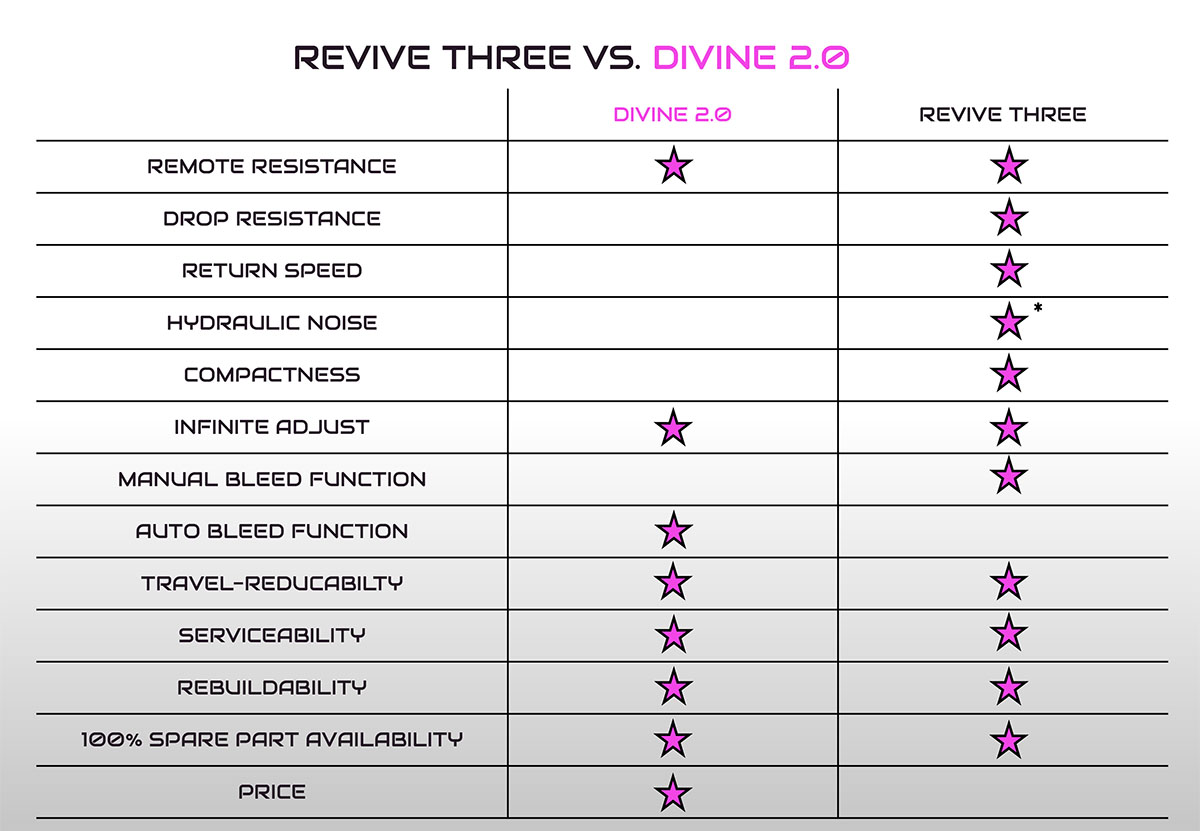 Met de Revive bouwde Bikeyoke een sterke reputatie op. De dropper zadelpen bleek robuust en gemakkelijk in onderhoud. Met de daaropvolgende Divine bracht Bikeyoke een dropper-zadelpen die je nooit meer hoefde te ‘reviven’. Geen hendeltje op de kop, maar een interne constructie die zichzelf continu ontlucht. Dat leverde bovendien ook nog eens een iets goedkopere zadelpen op, met als enige nadeel dat de Divine iets minder smeuïg werkt dan de Revive.