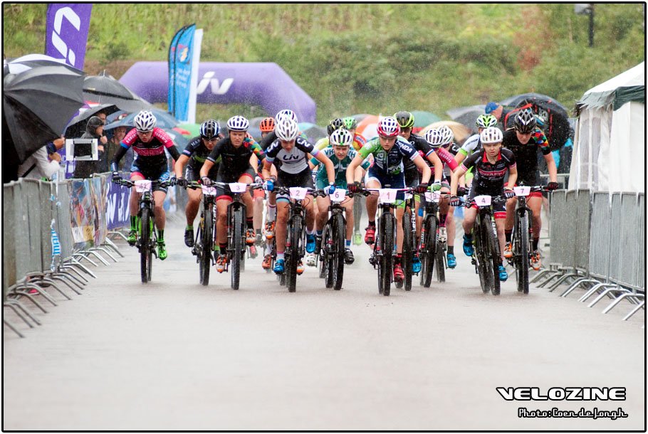 De start bij de vrouwen, regen komt met bakken uit de lucht en hier zijn de meiden nog herkenbaar…
