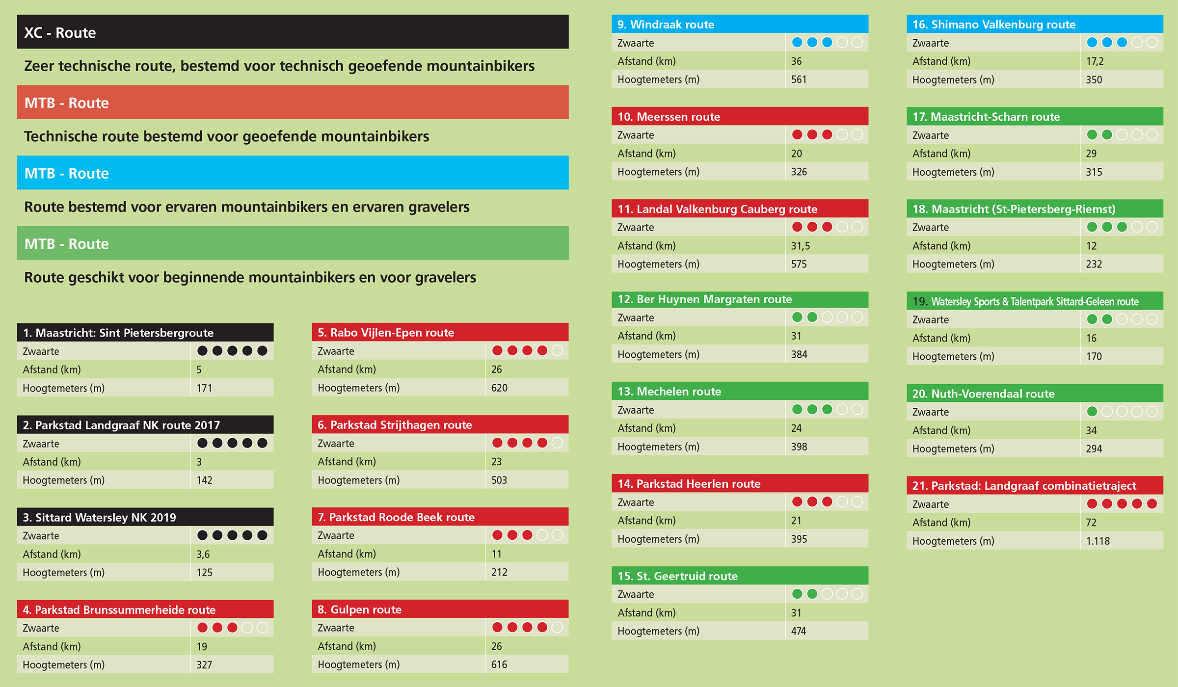 MOZL, de organisatie die de 21 mountainbikeroutes in Zuid-Limburg onderhoudt en de belangen daarvan behartigt, heeft dus nu al zo’n kleurensysteem. En die kleuren lijken goed overeen te komen met wat de NTFU nu voorstelt. We gaven eerder al aan dat MOZL óók deel uit maakt van de Expertgroep MTB die bij dit initiatief betrokken is. Toch bewandelt MOZL een eigen pad. Eens te meer benadrukt door het gegeven dat de NTFU in haar persbericht verkondigt dat zij verwachten dat dit najaar (pas) de eerste routes het nieuwe classificatiesysteem zullen gebruiken. Juist ja, géén verwijzing naar Zuid-Limburg dus.