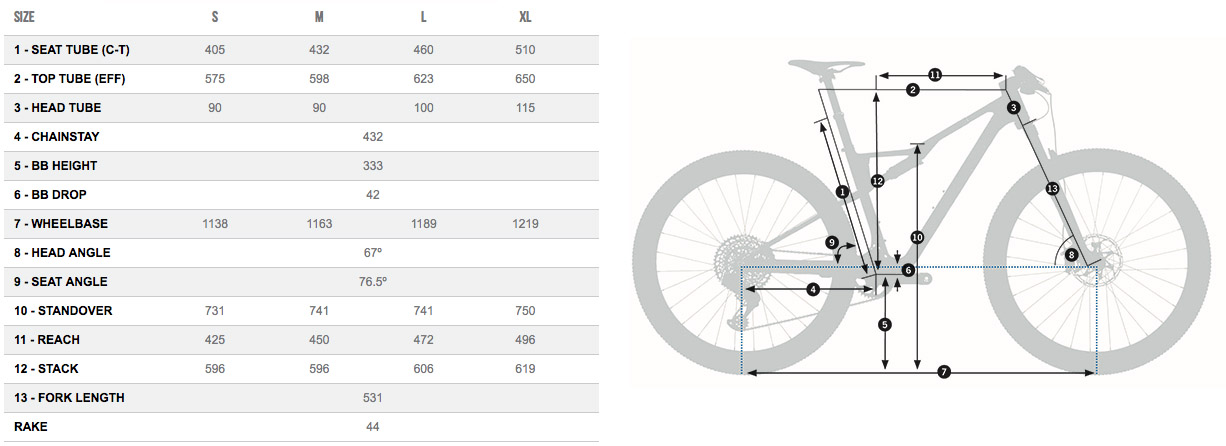 Met een balhoofdshoek van 67º is de 2023 Oiz een volle 2 graden vlakker dan z’n voorganger. De reach is ook vergroot en de zitbuishoek is van 75º naar 76,5º gezet. In de maat M is wielbasis van de Oiz zodoende 40 mm groter geworden. De achtervorklengte is overigens 2 mm groter, maar vervolgens wel bij elke framemaat gelijk.