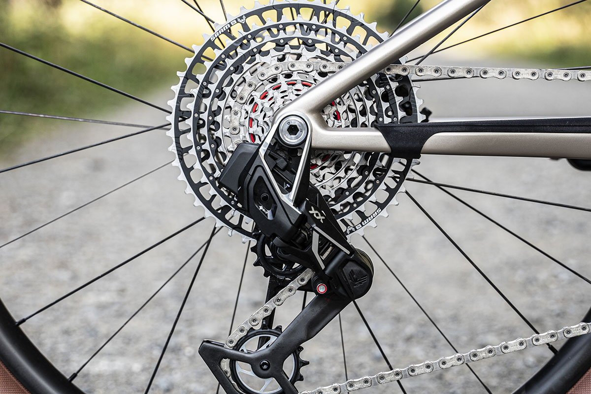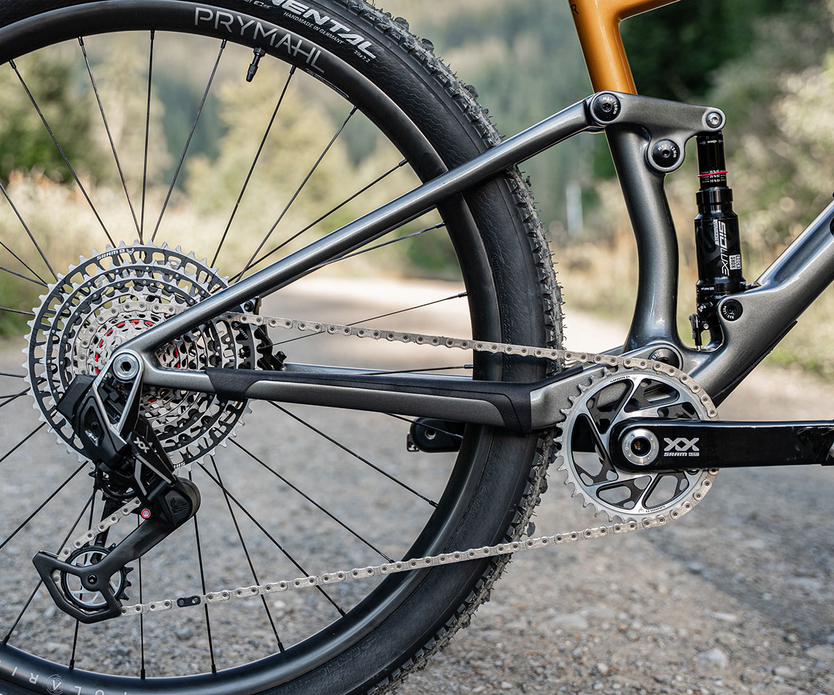 Met de demper met een langere slag (45 in plaats van 40 millimeter) herschrijft de Theoreme FS de definitie van downcountry zelfs, zo lezen we in het persbericht. Tja, het blijft bijzonder om te zien dat marketeers nog altijd een blinde vlek hebben voor ironie. De ‘downcountry’-term werd namelijk door een journalist van Pinkbike ooit bedacht als een dikke, vette knipoog naar de trend in de fietsindustrie om crosscountry-fullsuspensions iets meer veerweg te geven. Alsof 20 millimeter méér veerweg een crosscountry-fully omtovert tot een downhillmachine. Méér veerweg vergroot zeker de daalcapaciteiten en zonder extreem in te boeten op zaken als gewicht en trapefficiëntie, vergroot je daarmee wél het inzetgebied van de een xc-fully, terwijl tegelijkertijd xc-parcoursen óók extremer worden. Aan jou of dat dat werkelijk een eigen naam mag of moet hebben.
