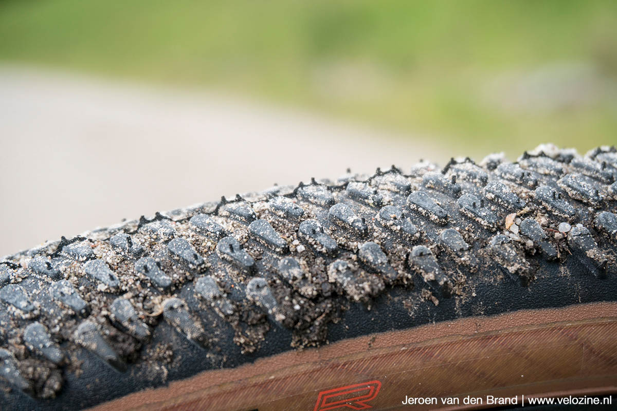 Zoals te verwachten was, heeft het boomerangprofiel veel grip; het wordt de band in droge omstandigheden niet snel te veel. Tijdens de regenperiode een paar weken terug viel wel op dat de krappe ruimte tussen de noppen bovenop wel wat sneller dichtslibt. Niet geheel verrassend, maar tegelijkertijd lost het Addix Race-rubber toch vrij gemakkelijk. Op de mate van grip had het nauwelijks negatieve impact. Het soepele karkas draagt hier beslist aan bij. Wanneer ik veel offroad secties voor de boeg heb, rij ik (met mijn gewicht van 66 kg) bij een band van deze breedte typisch met 1.2 tot 1.7 bar. Bij hard insturen volgt de band dan nauwgezet, terwijl-ie op boomwortels en kuilen ‘lekker’ meegeeft. Daarbij slaat de band niet door en veert niet te hard terug, iets wat bij een stugger karkas eerder het geval is.