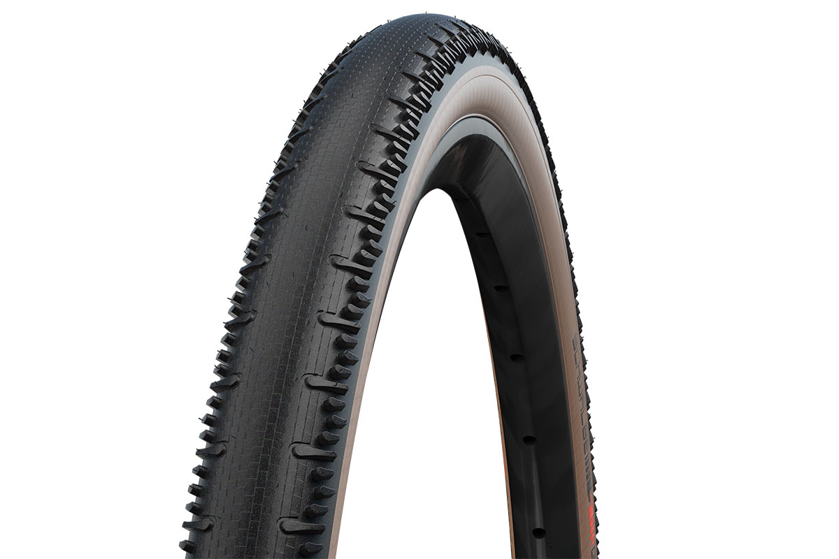 Om de rolweerstand verder te verlagen is de G-One RS gemaakt met Schwalbe’s soepele Super Race-karkas, waarbij je altijd de transparante zijkanten hebt. We kennen dit onder meer van de G-One R en de mountainbikebanden, waar Schwalbe dit karkas-type introduceerde. Dit karkas bestaat uit slechts 2 lagen van 67 tpi onder het loopvlak. Dit komt de soepelheid ten goede. De wangen zijn gemaakt met 3 lagen van 67 tpi en zorgen voor stabiliteit. De combinatie van het profiel, het Addix-Speed rubber én het Super Race-karkas zou de G-One RS tot 20% lichter laten rollen dan de G-One R gravelband, aldus Schwalbe.